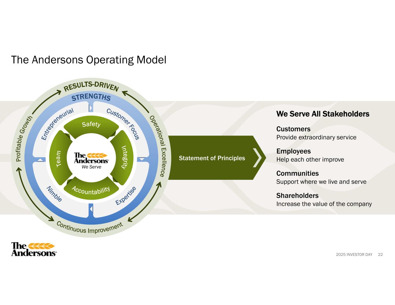 2025 INVESTOR DAY 22 The Andersons Operating Model We Serve All Stakeholders Customers Provide extraordinary service Employees Help each other improve Communities Support where we live and serve Shareholders Increase the value of the company Statement of Principles We Serve