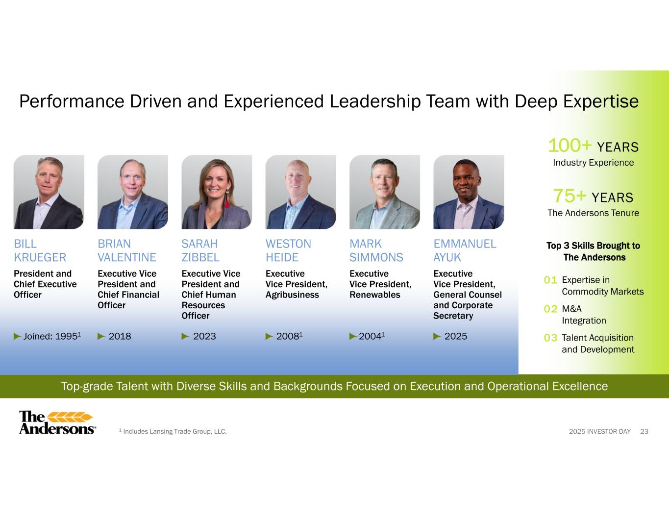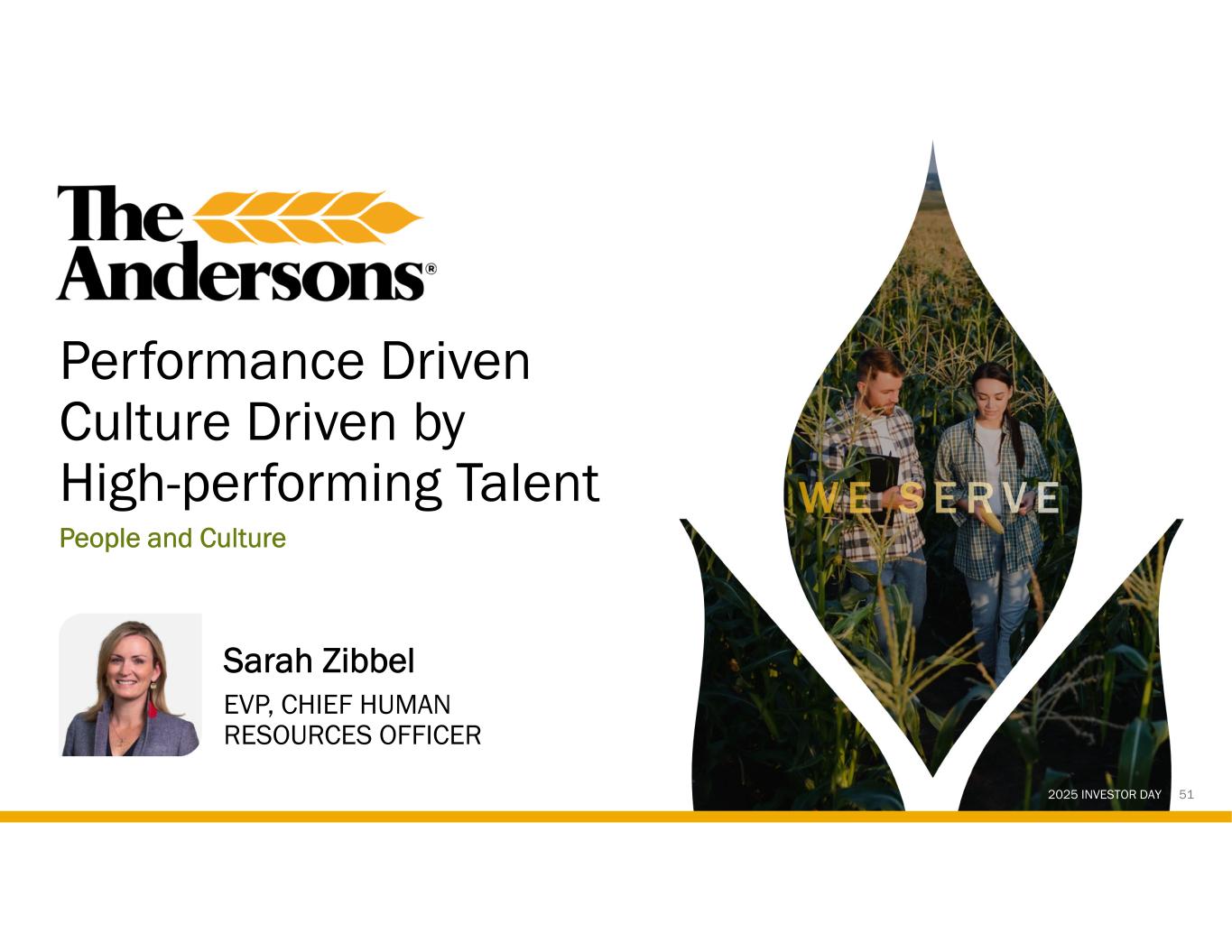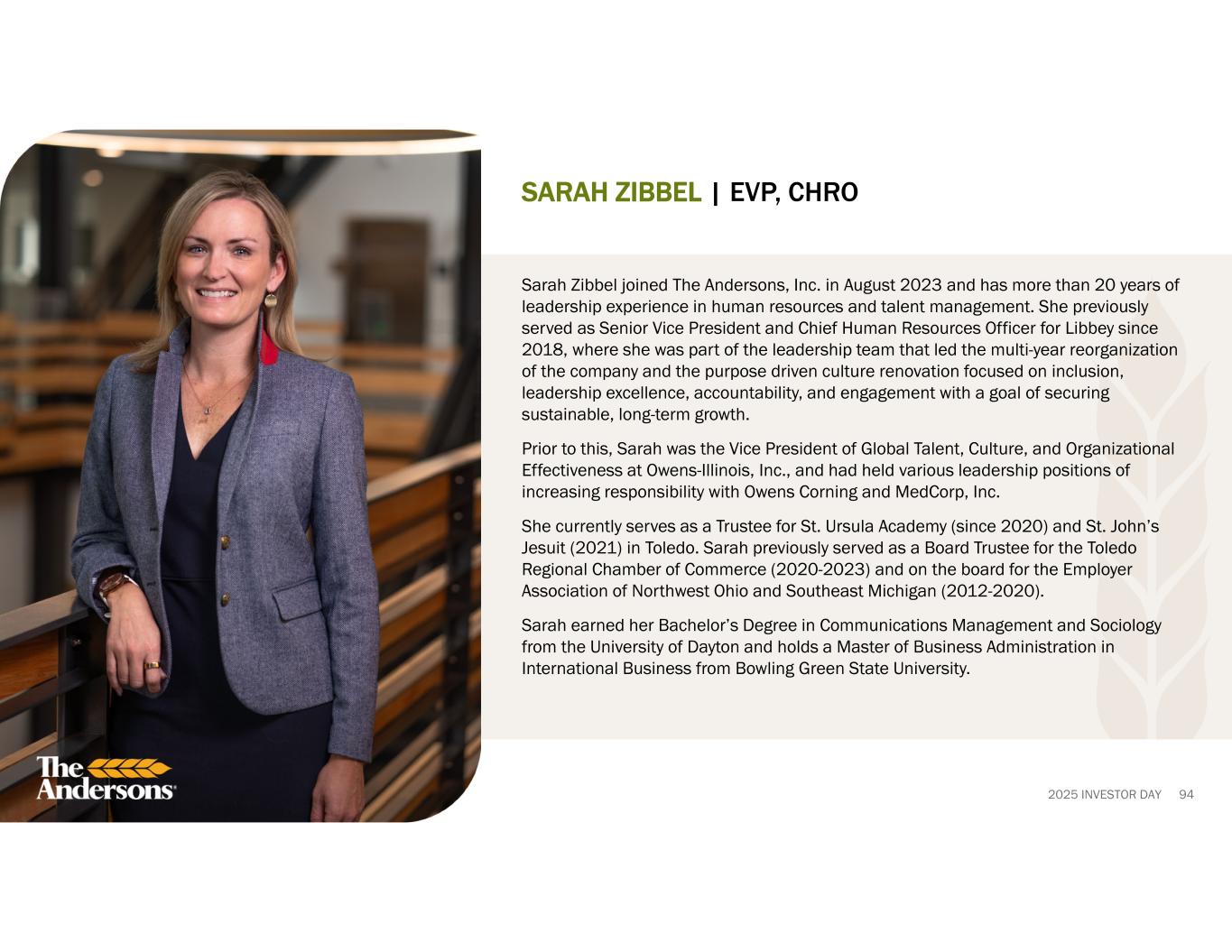 2025 INVESTOR DAY 94 SARAH ZIBBEL | EVP, CHRO Sarah Zibbel joined The Andersons, Inc. in August 2023 and has more than 20 years of leadership experience in human resources and talent management. She previously served as Senior Vice President and Chief Human Resources Officer for Libbey since 2018, where she was part of the leadership team that led the multi-year reorganization of the company and the purpose driven culture renovation focused on inclusion, leadership excellence, accountability, and engagement with a goal of securing sustainable, long-term growth. Prior to this, Sarah was the Vice President of Global Talent, Culture, and Organizational Effectiveness at Owens-Illinois, Inc., and had held various leadership positions of increasing responsibility with Owens Corning and MedCorp, Inc. She currently serves as a Trustee for St. Ursula Academy (since 2020) and St. John’s Jesuit (2021) in Toledo. Sarah previously served as a Board Trustee for the Toledo Regional Chamber of Commerce (2020-2023) and on the board for the Employer Association of Northwest Ohio and Southeast Michigan (2012-2020). Sarah earned her Bachelor’s Degree in Communications Management and Sociology from the University of Dayton and holds a Master of Business Administration in International Business from Bowling Green State University.