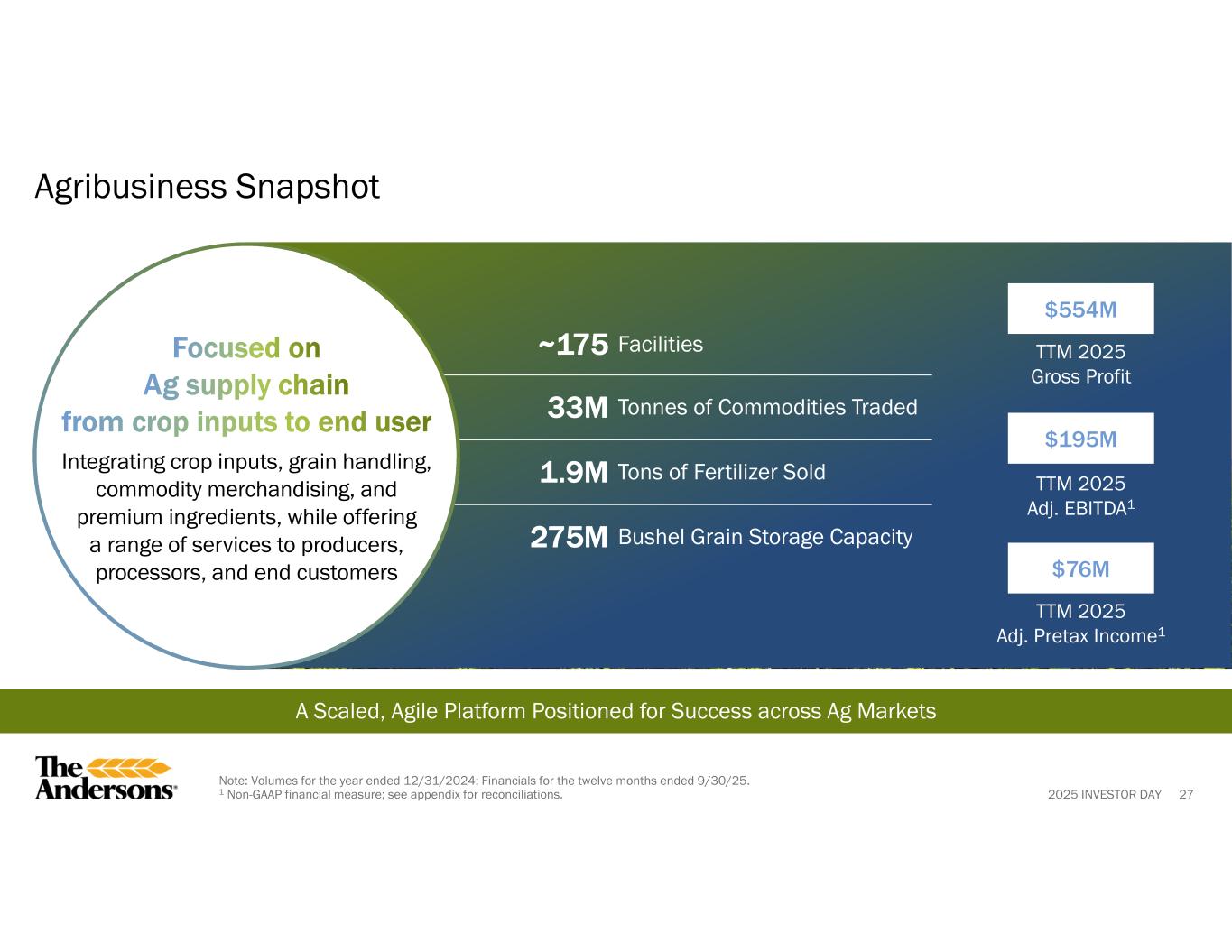 2025 INVESTOR DAY 26 Key Messages Well-positioned for long-term profitable growth with deep understanding of agricultural markets complemented with logistics expertise Leveraging ability to serve the Ag Supply Chain – from farmers to end users through a focused, value-add approach that delivers meaningful impact Strategically expanding through targeted organic investments and complementary acquisitions Driving stable, diversified earnings through a balanced mix of geographies, ag products, and revenue streams that perform through ag cycles 01 02 03 04