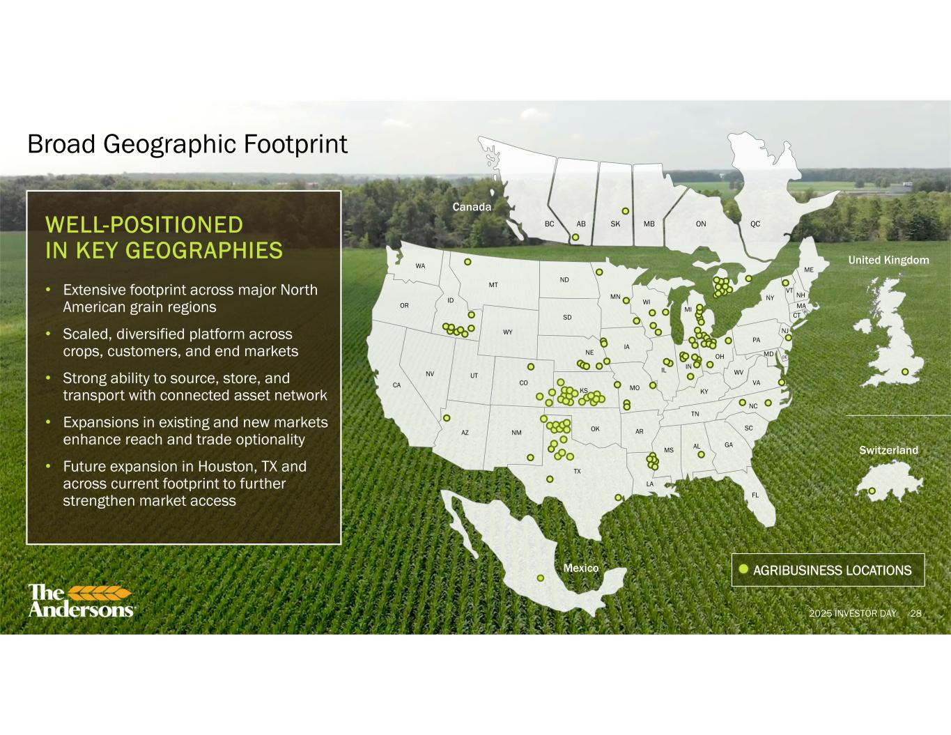 2025 INVESTOR DAY 28 Broad Geographic Footprint United Kingdom Switzerland AGRIBUSINESS LOCATIONS CO KS OK SD WY IA NE MO NM TX AZ UTNV CA OR WA ID MT ND MN IL WI MI IN AR LA MS AL TN KY GA FL SC NC VA WV MD DE PA OH NY VT CT MA NH ME RI Mexico NJ BC AB SK MB QCON Canada WELL-POSITIONED IN KEY GEOGRAPHIES • Extensive footprint across major North American grain regions • Scaled, diversified platform across crops, customers, and end markets • Strong ability to source, store, and transport with connected asset network • Expansions in existing and new markets enhance reach and trade optionality • Future expansion in Houston, TX and across current footprint to further strengthen market access