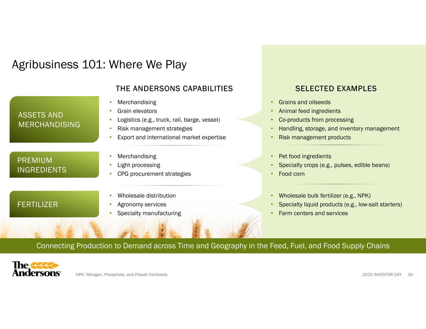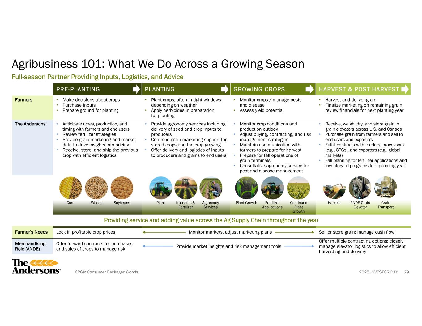 2025 INVESTOR DAY HARVEST & POST HARVESTGROWING CROPSPLANTINGPRE-PLANTING • Harvest and deliver grain • Finalize marketing on remaining grain; review financials for next planting year • Monitor crops / manage pests and disease • Assess yield potential • Plant crops, often in tight windows depending on weather • Apply herbicides in preparation for planting • Make decisions about crops • Purchase inputs • Prepare ground for planting Farmers • Receive, weigh, dry, and store grain in grain elevators across U.S. and Canada • Purchase grain from farmers and sell to end users and exporters • Fulfill contracts with feeders, processors (e.g., CPGs), and exporters (e.g., global markets) • Fall planning for fertilizer applications and inventory fill programs for upcoming year • Monitor crop conditions and production outlook • Adjust buying, contracting, and risk management strategies • Maintain communication with farmers to prepare for harvest • Prepare for fall operations of grain terminals • Consultative agronomy service for pest and disease management • Provide agronomy services including delivery of seed and crop inputs to producers • Continue grain marketing support for stored crops and the crop growing • Offer delivery and logistics of inputs to producers and grains to end users • Anticipate acres, production, and timing with farmers and end users • Review fertilizer strategies • Provide grain marketing and market data to drive insights into pricing • Receive, store, and ship the previous crop with efficient logistics The Andersons Providing service and adding value across the Ag Supply Chain throughout the year Sell or store grain; manage cash flowMonitor markets, adjust marketing plansLock in profitable crop pricesFarmer’s Needs Offer multiple contracting options; closely manage elevator logistics to allow efficient harvesting and delivery Provide market insights and risk management toolsOffer forward contracts for purchases and sales of crops to manage risk Merchandising Role (ANDE) 29 Agribusiness 101: What We Do Across a Growing Season Full-season Partner Providing Inputs, Logistics, and Advice Corn Wheat Soybeans Plant Growth Continued Plant Growth Fertilizer Applications Harvest Grain Transport ANDE Grain Elevator Plant Agronomy Services Nutrients & Fertilizer CPGs: Consumer Packaged Goods.