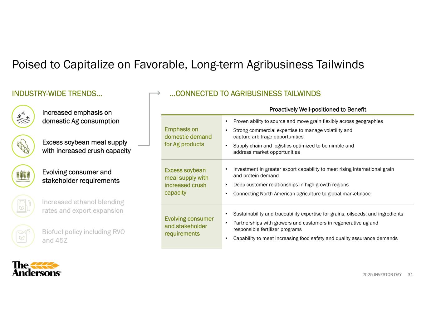 2025 INVESTOR DAY PREMIUM INGREDIENTS • Merchandising • Light processing • CPG procurement strategies • Pet food ingredients • Specialty crops (e.g., pulses, edible beans) • Food corn THE ANDERSONS CAPABILITIES SELECTED EXAMPLES ASSETS AND MERCHANDISING • Merchandising • Grain elevators • Logistics (e.g., truck, rail, barge, vessel) • Risk management strategies • Export and international market expertise • Grains and oilseeds • Animal feed ingredients • Co-products from processing • Handling, storage, and inventory management • Risk management products 30 Connecting Production to Demand across Time and Geography in the Feed, Fuel, and Food Supply Chains Agribusiness 101: Where We Play NPK: Nitrogen, Phosphate, and Potash Fertilizers. FERTILIZER • Wholesale distribution • Agronomy services • Specialty manufacturing • Wholesale bulk fertilizer (e.g., NPK) • Specialty liquid products (e.g., low-salt starters) • Farm centers and services