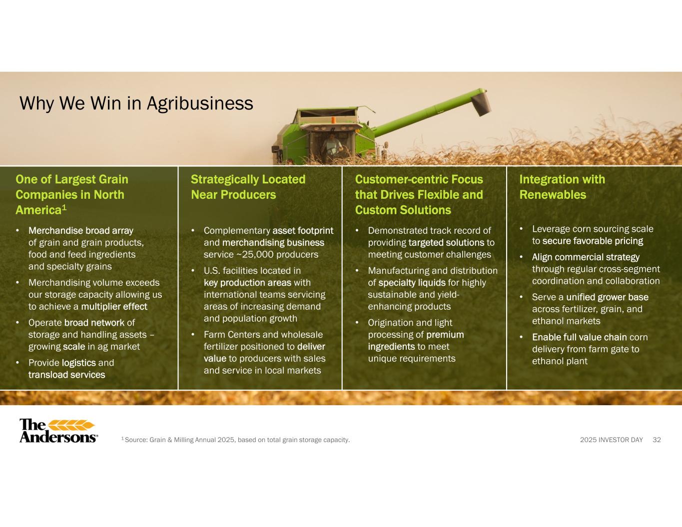 2025 INVESTOR DAY 31 Poised to Capitalize on Favorable, Long-term Agribusiness Tailwinds INDUSTRY-WIDE TRENDS… …CONNECTED TO AGRIBUSINESS TAILWINDS • Proven ability to source and move grain flexibly across geographies • Strong commercial expertise to manage volatility and capture arbitrage opportunities • Supply chain and logistics optimized to be nimble and address market opportunities Emphasis on domestic demand for Ag products • Investment in greater export capability to meet rising international grain and protein demand • Deep customer relationships in high-growth regions • Connecting North American agriculture to global marketplace Excess soybean meal supply with increased crush capacity • Sustainability and traceability expertise for grains, oilseeds, and ingredients • Partnerships with growers and customers in regenerative ag and responsible fertilizer programs • Capability to meet increasing food safety and quality assurance demands Evolving consumer and stakeholder requirements Proactively Well-positioned to BenefitIncreased emphasis on domestic Ag consumption Excess soybean meal supply with increased crush capacity Evolving consumer and stakeholder requirements Increased ethanol blending rates and export expansion Biofuel policy including RVO and 45Z