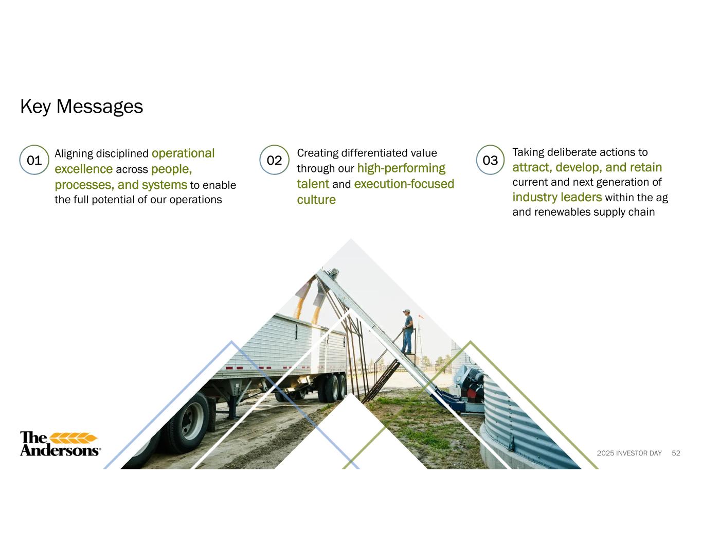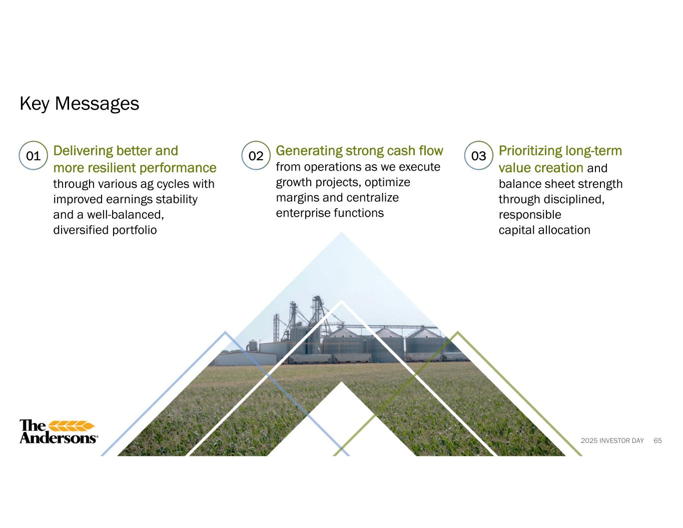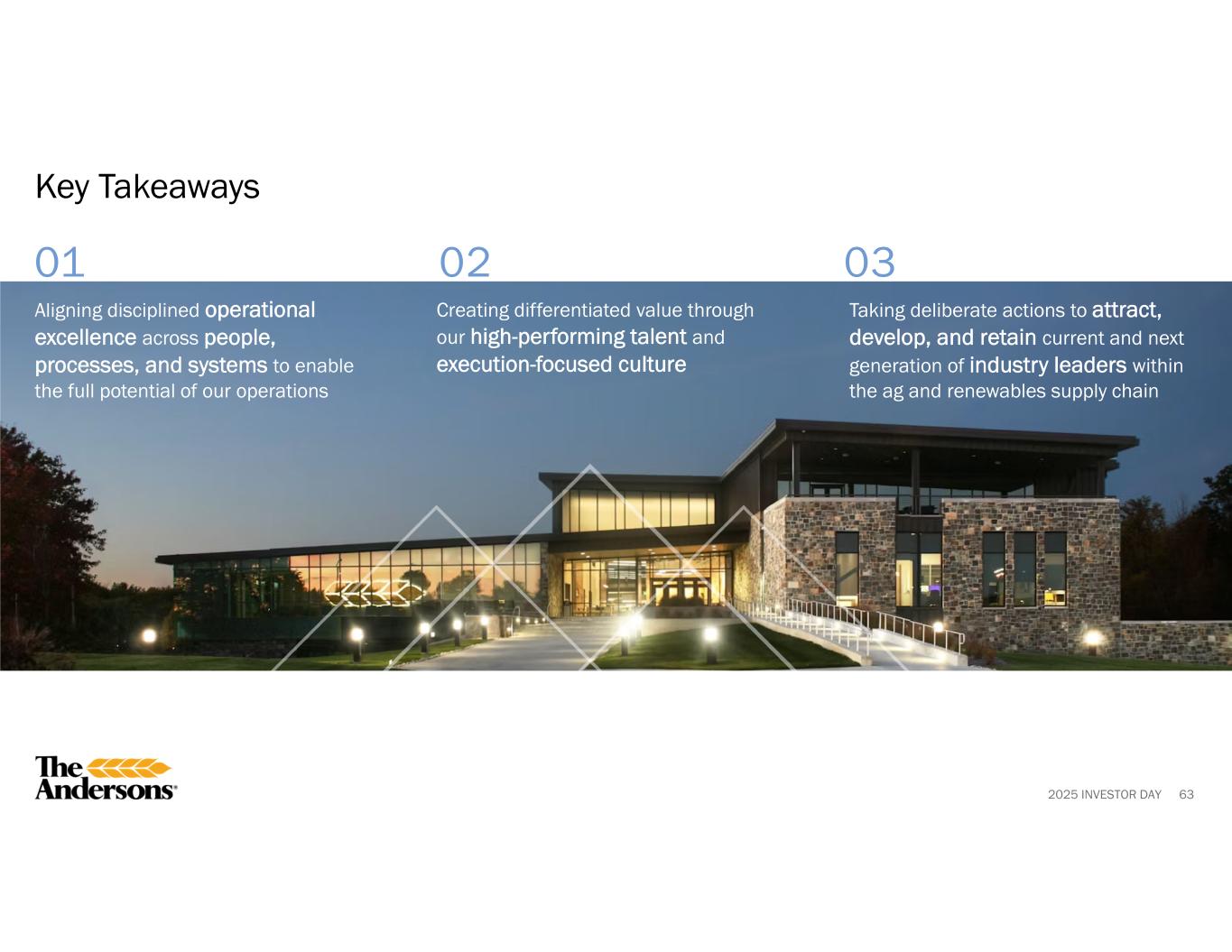 2025 INVESTOR DAY 01 02 03 63 Key Takeaways Creating differentiated value through our high-performing talent and execution-focused culture Taking deliberate actions to attract, develop, and retain current and next generation of industry leaders within the ag and renewables supply chain Aligning disciplined operational excellence across people, processes, and systems to enable the full potential of our operations