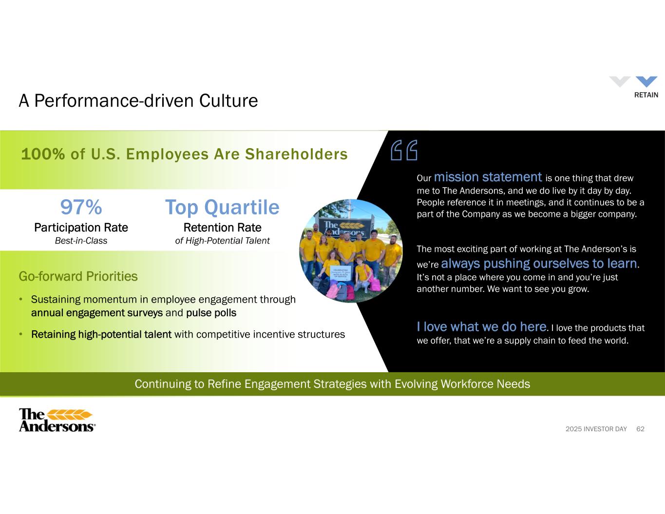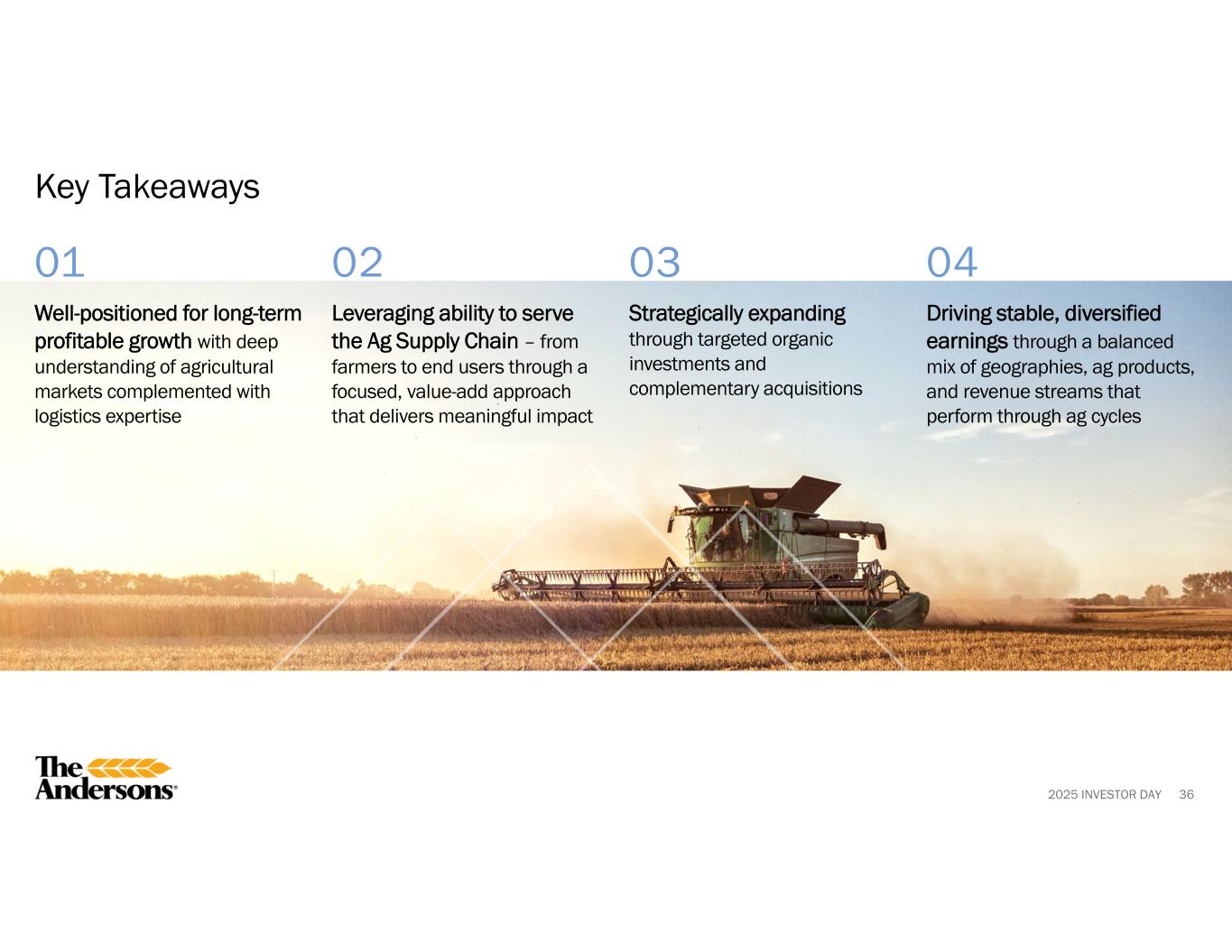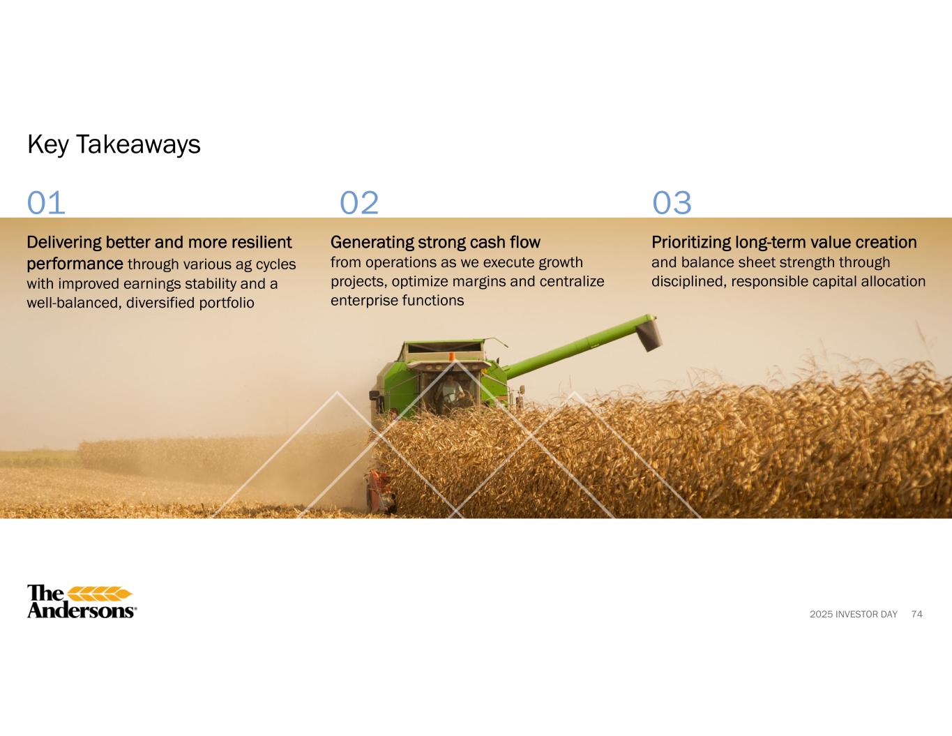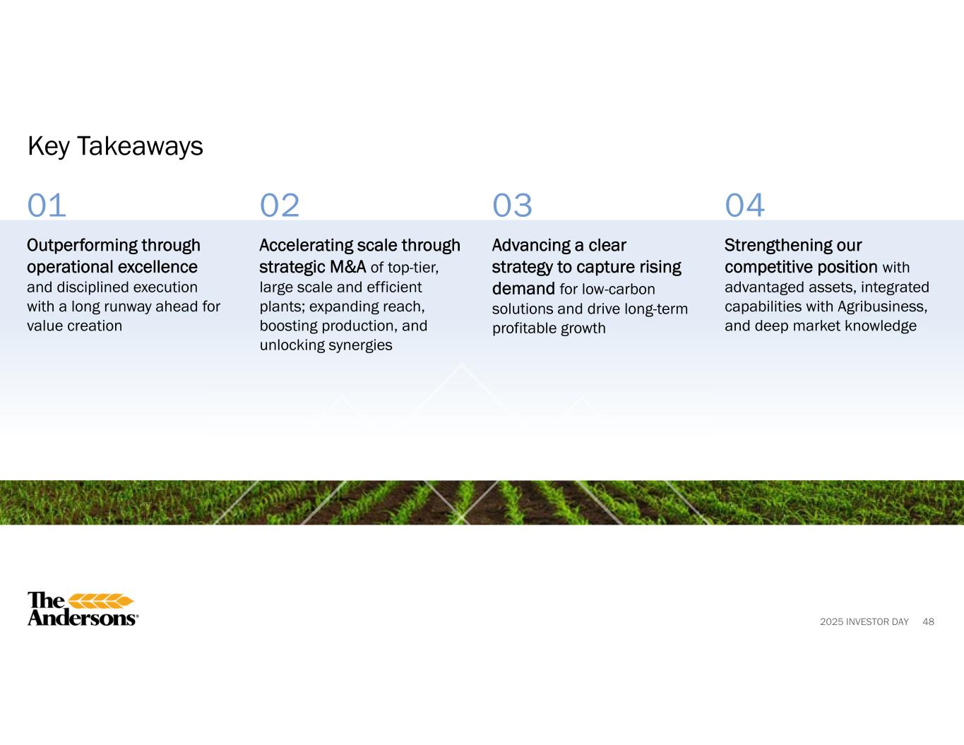 2025 INVESTOR DAY 01 02 03 63 Key Takeaways Creating differentiated value through our high-performing talent and execution-focused culture Taking deliberate actions to attract, develop, and retain current and next generation of industry leaders within the ag and renewables supply chain Aligning disciplined operational excellence across people, processes, and systems to enable the full potential of our operations