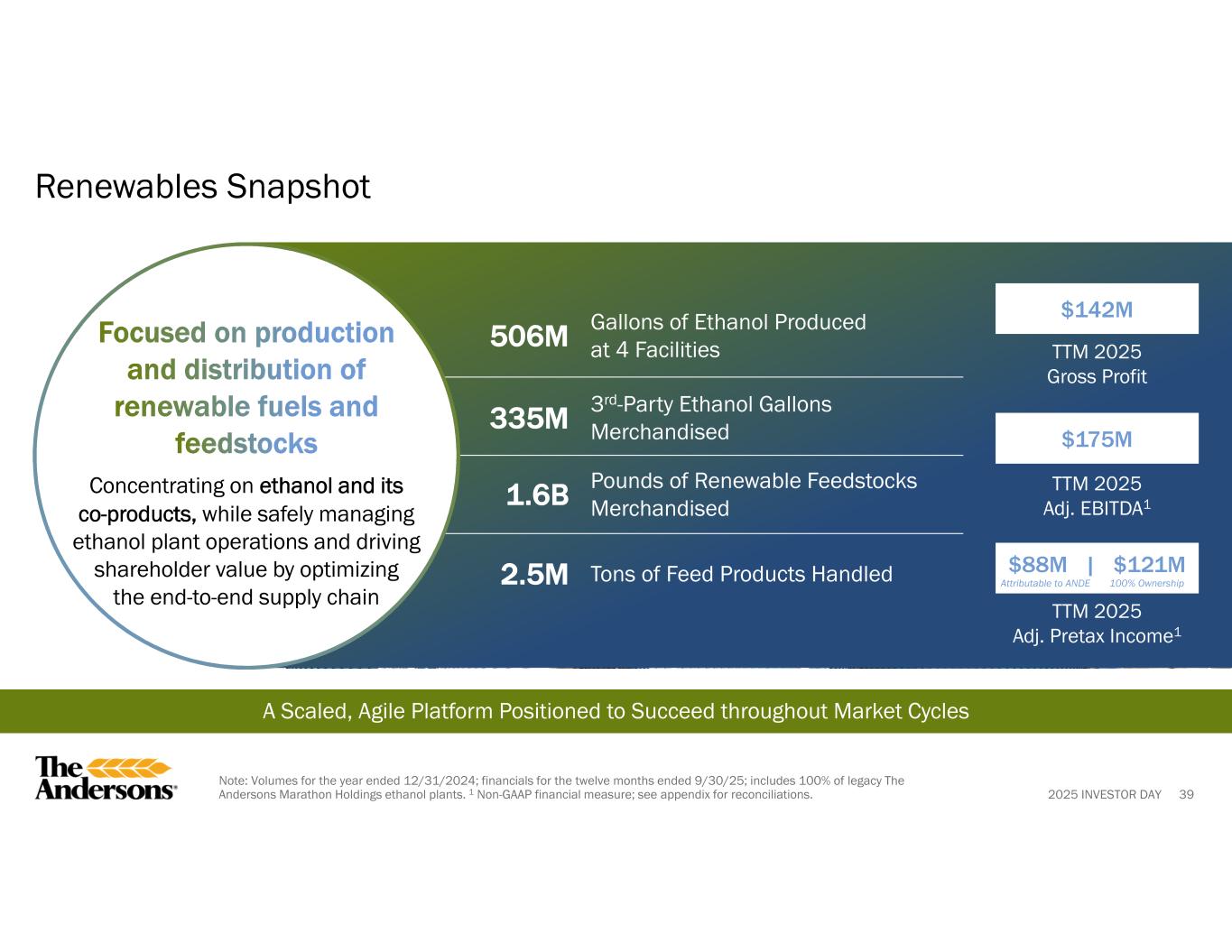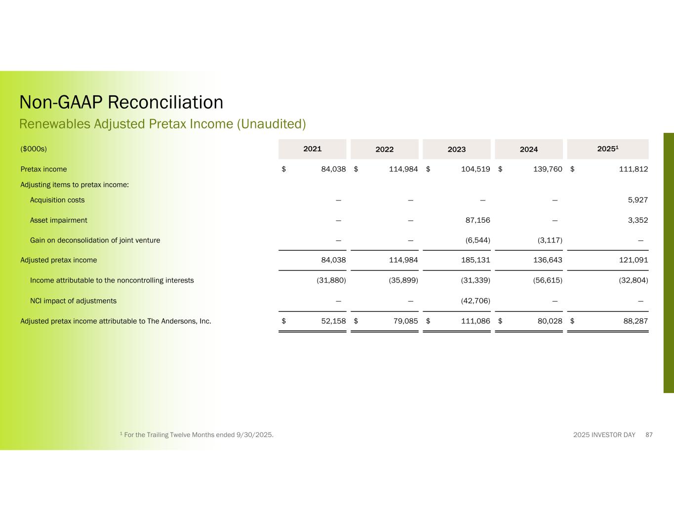 2025 INVESTOR DAY 202512024202320222021($000s) $ 111,812$ 139,760$ 104,519$ 114,984$ 84,038Pretax income Adjusting items to pretax income: 5,927————Acquisition costs 3,352—87,156——Asset impairment —(3,117)(6,544)——Gain on deconsolidation of joint venture 121,091136,643185,131114,98484,038Adjusted pretax income (32,804)(56,615)(31,339)(35,899)(31,880)Income attributable to the noncontrolling interests ——(42,706)——NCI impact of adjustments $ 88,287$ 80,028$ 111,086$ 79,085$ 52,158Adjusted pretax income attributable to The Andersons, Inc. Non-GAAP Reconciliation Renewables Adjusted Pretax Income (Unaudited) 871 For the Trailing Twelve Months ended 9/30/2025.