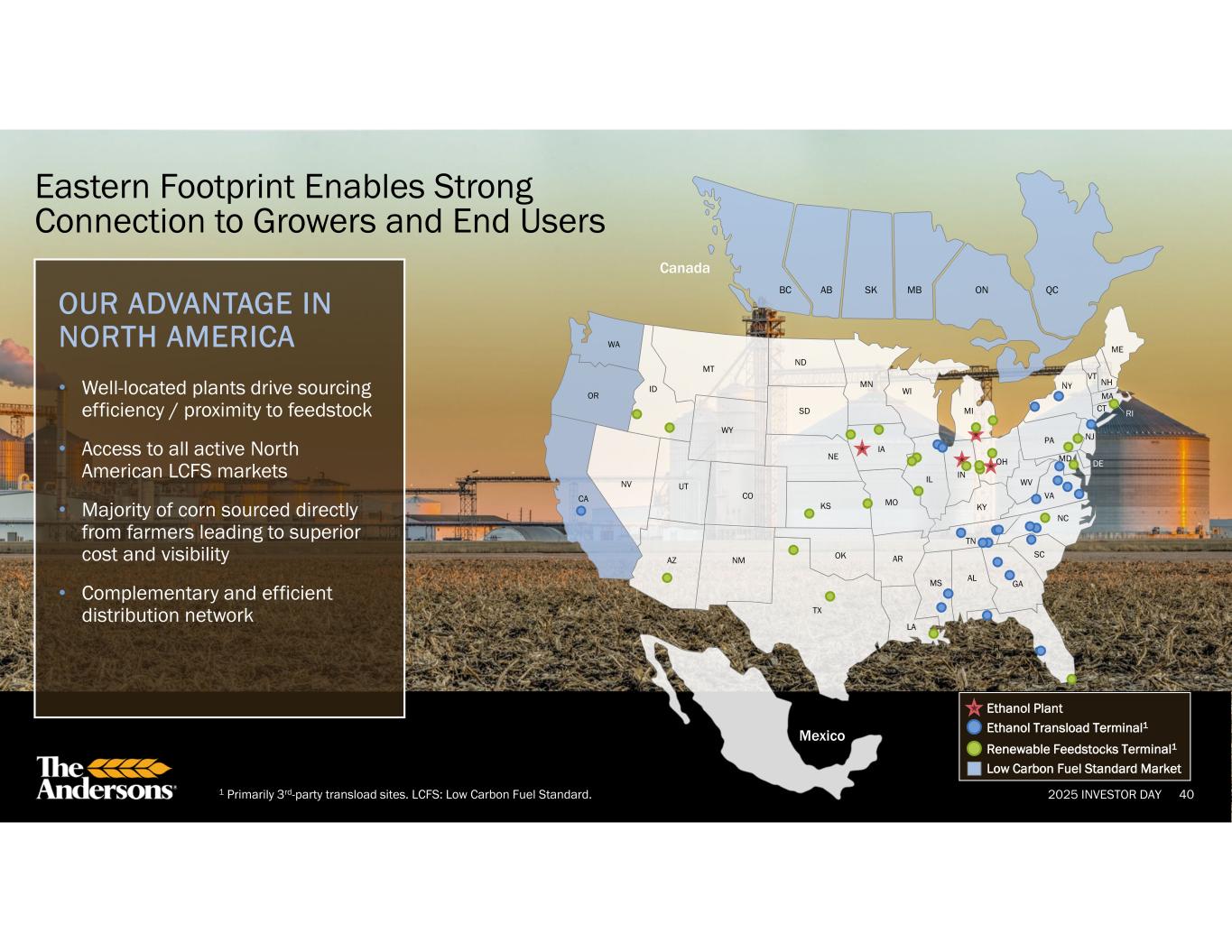 2025 INVESTOR DAY CO KS OK SD WY IA NE MO NM TX AZ UTNV CA OR WA ID MT ND MN IL WI MI IN AR LA MS AL TN KY GA SC NC VA WV MD PA OH NY VT CT MA NH ME RI NJ OUR ADVANTAGE IN NORTH AMERICA • Well-located plants drive sourcing efficiency / proximity to feedstock • Access to all active North American LCFS markets • Majority of corn sourced directly from farmers leading to superior cost and visibility • Complementary and efficient distribution network 40 Eastern Footprint Enables Strong Connection to Growers and End Users Canada BC AB SK MB QCON Mexico FL Ethanol Plant Low Carbon Fuel Standard Market Renewable Feedstocks Terminal1 DE Ethanol Transload Terminal1 1 Primarily 3rd-party transload sites. LCFS: Low Carbon Fuel Standard.