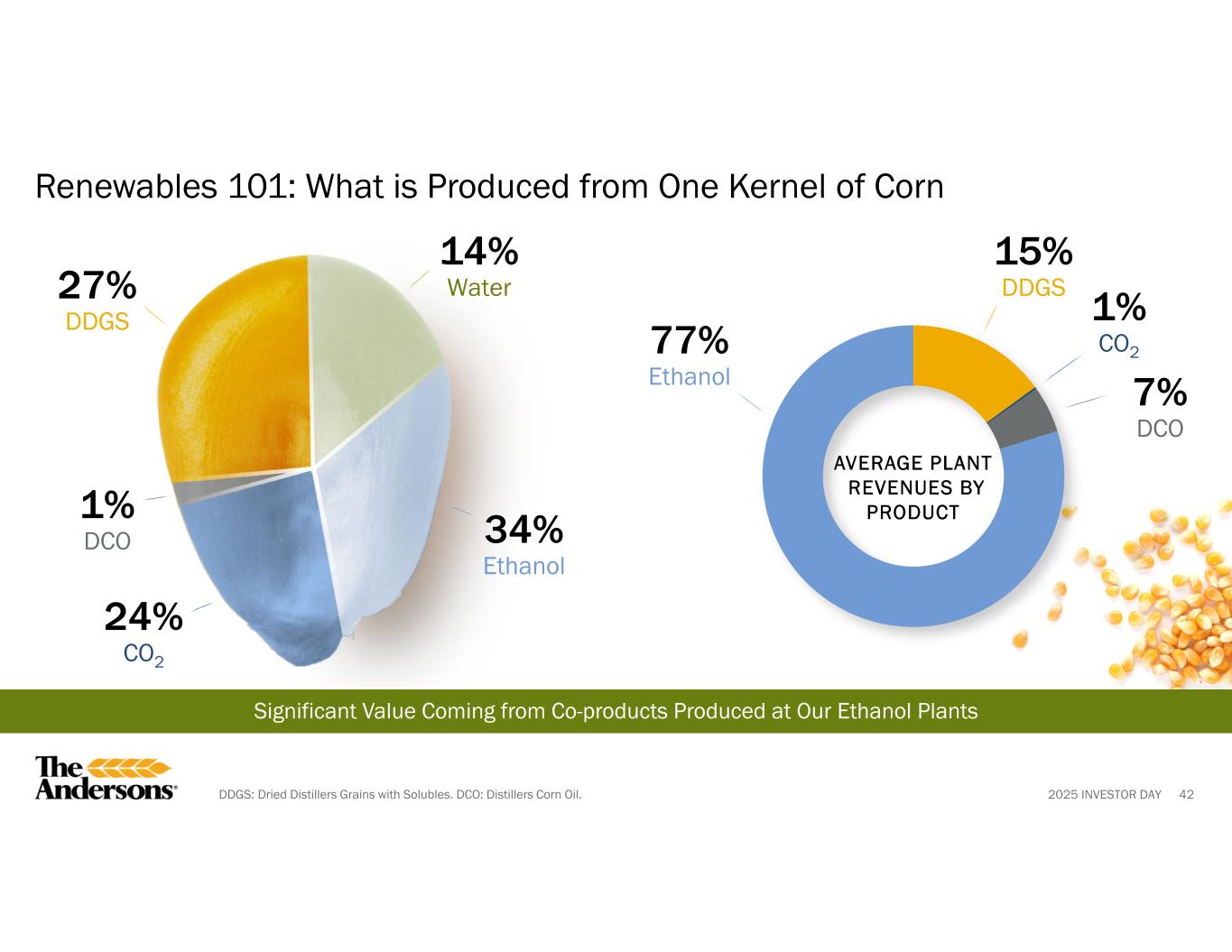 2025 INVESTOR DAY 41 Renewables 101: Where We Play SPOTLIGHT Collaboration with Agribusiness • Ensure supply reliability, price risk management, and logistics for moving corn to ethanol plants • Offer comprehensive fundamental market analysis • Leverage asset capabilities • Provide co-product export logistics Ethanol Production • Own and operate 4 ethanol plants • Produce fuel-grade ethanol from corn, mainly used for blending with gasoline to reduce emissions • Invest in carbon intensity reduction, efficiencies, and carbon capture, utilization, and sequestration Co-Product Sales • DDGS: used for animal feed • DCO: extracted during ethanol production, used for biofuel or animal feed • CO2: captured and sold for use in food, beverage, or industrial applications Merchandising • Merchandise ethanol through strategic partnerships • Source and supply renewable feedstocks to bio-based diesel markets • Major supplier and exporter of DDGS DDGS: Dried Distillers Grains with Solubles. DCO: Distillers Corn Oil.