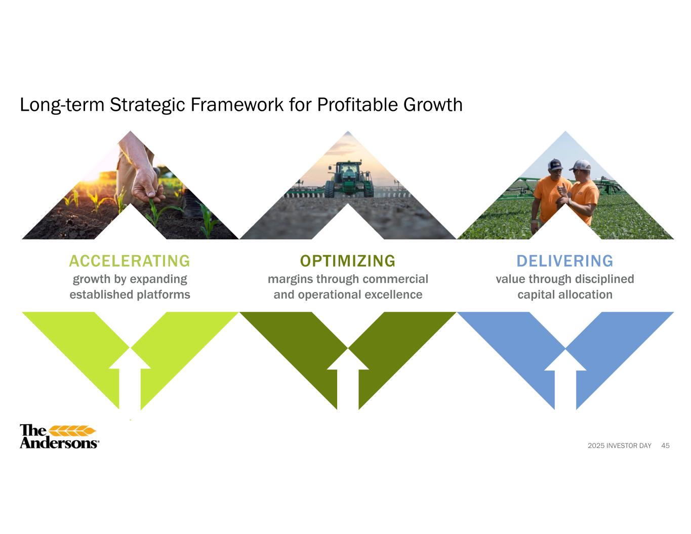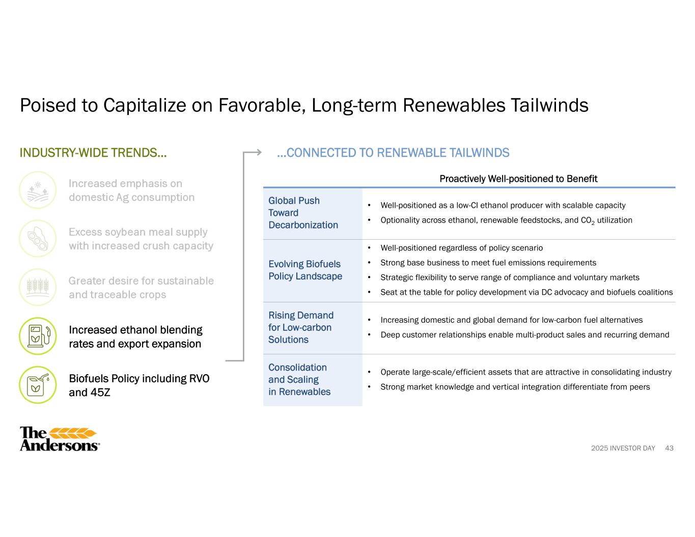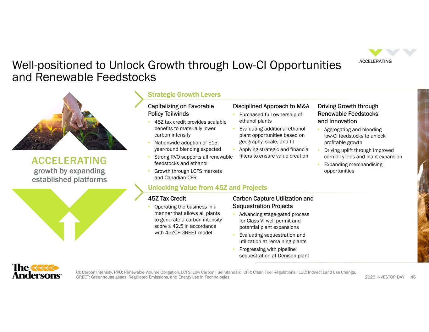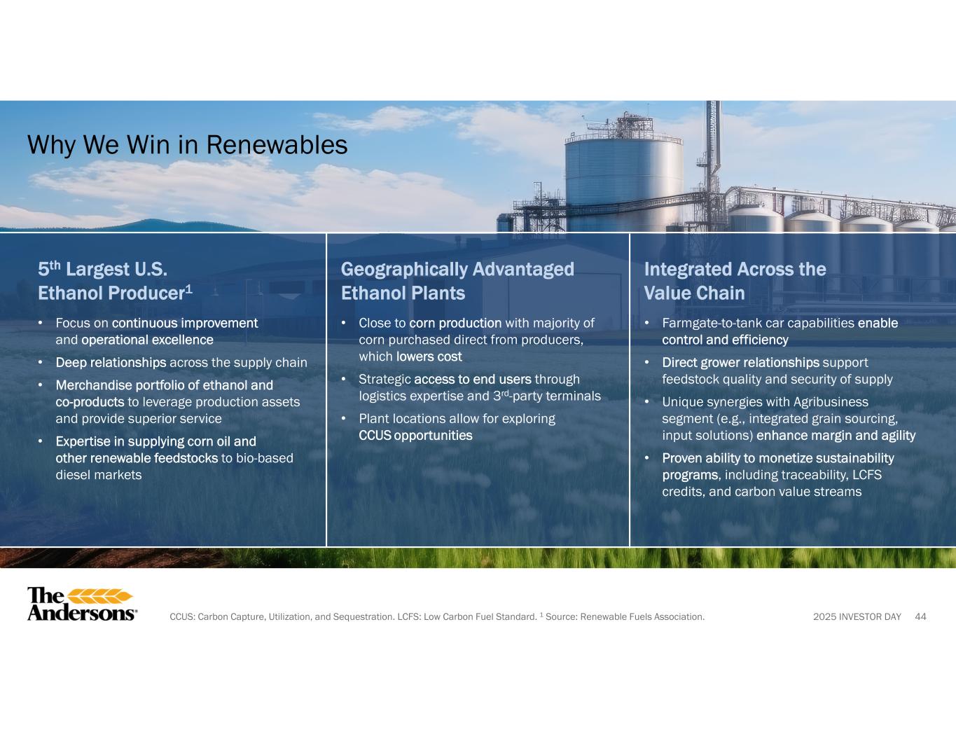 2025 INVESTOR DAYCCUS: Carbon Capture, Utilization, and Sequestration. LCFS: Low Carbon Fuel Standard. 1 Source: Renewable Fuels Association. Why We Win in Renewables 44 5th Largest U.S. Ethanol Producer1 • Focus on continuous improvement and operational excellence • Deep relationships across the supply chain • Merchandise portfolio of ethanol and co-products to leverage production assets and provide superior service • Expertise in supplying corn oil and other renewable feedstocks to bio-based diesel markets Geographically Advantaged Ethanol Plants • Close to corn production with majority of corn purchased direct from producers, which lowers cost • Strategic access to end users through logistics expertise and 3rd-party terminals • Plant locations allow for exploring CCUS opportunities Integrated Across the Value Chain • Farmgate-to-tank car capabilities enable control and efficiency • Direct grower relationships support feedstock quality and security of supply • Unique synergies with Agribusiness segment (e.g., integrated grain sourcing, input solutions) enhance margin and agility • Proven ability to monetize sustainability programs, including traceability, LCFS credits, and carbon value streams