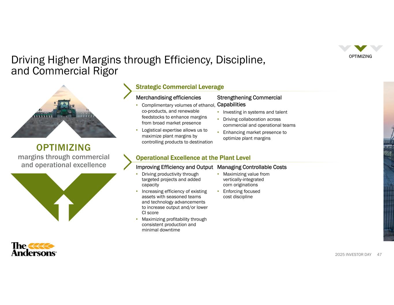 2025 INVESTOR DAY ACCELERATING growth by expanding established platforms 46 Well-positioned to Unlock Growth through Low-CI Opportunities and Renewable Feedstocks ACCELERATING Strategic Growth Levers Unlocking Value from 45Z and Projects CI: Carbon Intensity. RVO: Renewable Volume Obligation. LCFS: Low Carbon Fuel Standard. CFR: Clean Fuel Regulations. ILUC: Indirect Land Use Change. GREET: Greenhouse gases, Regulated Emissions, and Energy use in Technologies. Capitalizing on Favorable Policy Tailwinds • 45Z tax credit provides scalable benefits to materially lower carbon intensity • Nationwide adoption of E15 year-round blending expected • Strong RVO supports all renewable feedstocks and ethanol • Growth through LCFS markets and Canadian CFR Disciplined Approach to M&A • Purchased full ownership of ethanol plants • Evaluating additional ethanol plant opportunities based on geography, scale, and fit • Applying strategic and financial filters to ensure value creation Driving Growth through Renewable Feedstocks and Innovation • Aggregating and blending low-CI feedstocks to unlock profitable growth • Driving uplift through improved corn oil yields and plant expansion • Expanding merchandising opportunities 45Z Tax Credit • Operating the business in a manner that allows all plants to generate a carbon intensity score ≤ 42.5 in accordance with 45ZCF-GREET model Carbon Capture Utilization and Sequestration Projects • Advancing stage-gated process for Class VI well permit and potential plant expansions • Evaluating sequestration and utilization at remaining plants • Progressing with pipeline sequestration at Denison plant