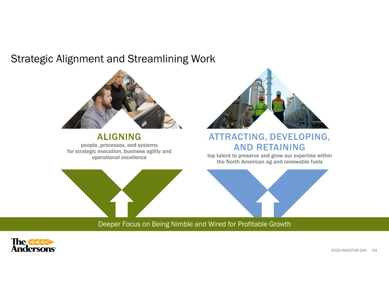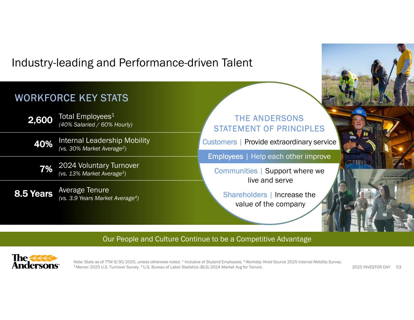 2025 INVESTOR DAY 53 Our People and Culture Continue to be a Competitive Advantage Industry-leading and Performance-driven Talent 40% Internal Leadership Mobility (vs. 30% Market Average2) 2,600 Total Employees1 (40% Salaried / 60% Hourly) 8.5 Years Average Tenure (vs. 3.9 Years Market Average4) 7% 2024 Voluntary Turnover (vs. 13% Market Average3) WORKFORCE KEY STATS THE ANDERSONS STATEMENT OF PRINCIPLES Customers | Provide extraordinary service Employees | Help each other improve Communities | Support where we live and serve Shareholders | Increase the value of the company Note: Stats as of TTM 9/30/2025, unless otherwise noted. 1 Inclusive of Skyland Employees. 2 Workday Hired Source 2025 Internal Mobility Survey. 3 Mercer 2025 U.S. Turnover Survey. 4 U.S. Bureau of Labor Statistics (BLS) 2024 Market Avg for Tenure.