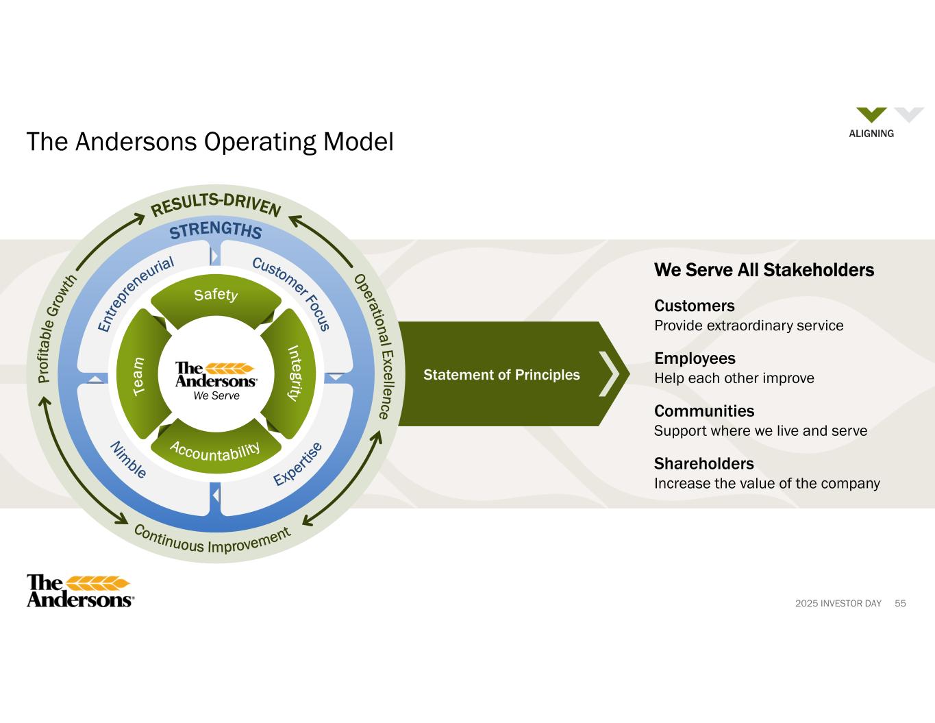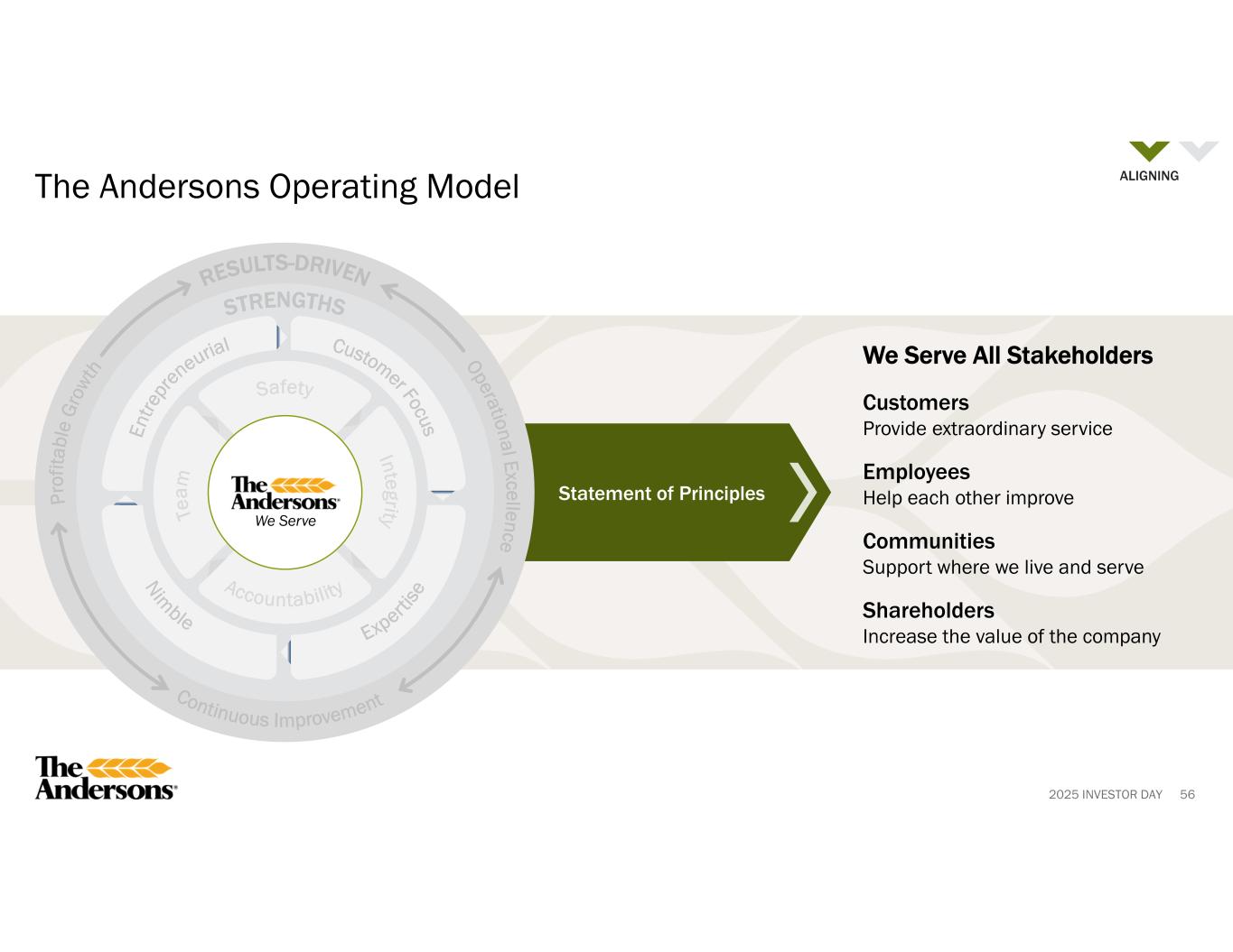 2025 INVESTOR DAY Statement of Principles We Serve All Stakeholders Customers Provide extraordinary service Employees Help each other improve Communities Support where we live and serve Shareholders Increase the value of the company 55 The Andersons Operating Model We Serve ALIGNING