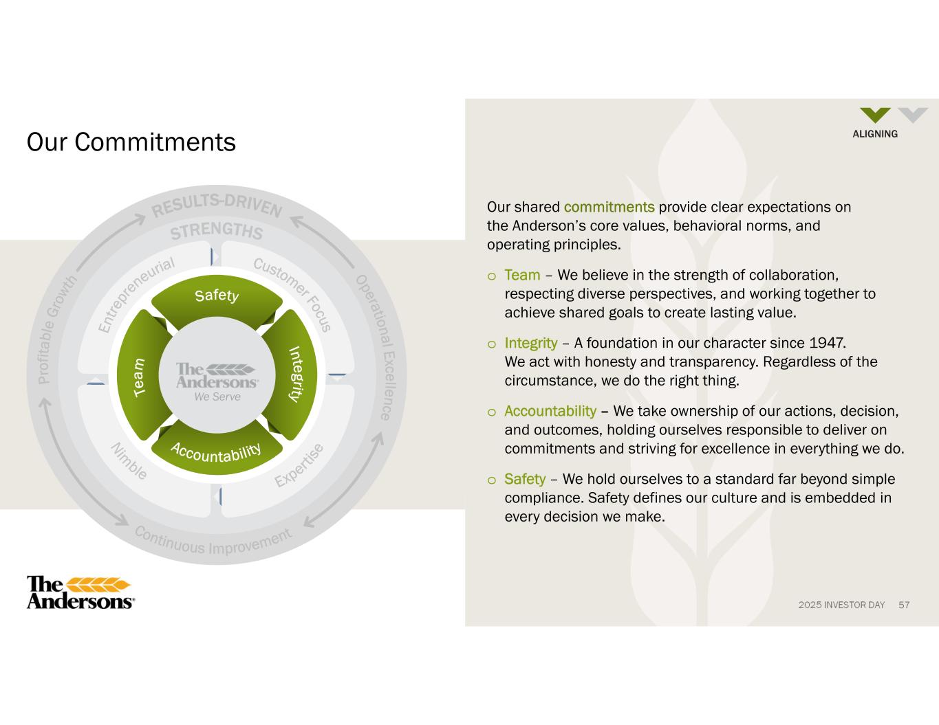 2025 INVESTOR DAY Statement of Principles We Serve All Stakeholders Customers Provide extraordinary service Employees Help each other improve Communities Support where we live and serve Shareholders Increase the value of the company 56 The Andersons Operating Model We Serve ALIGNING