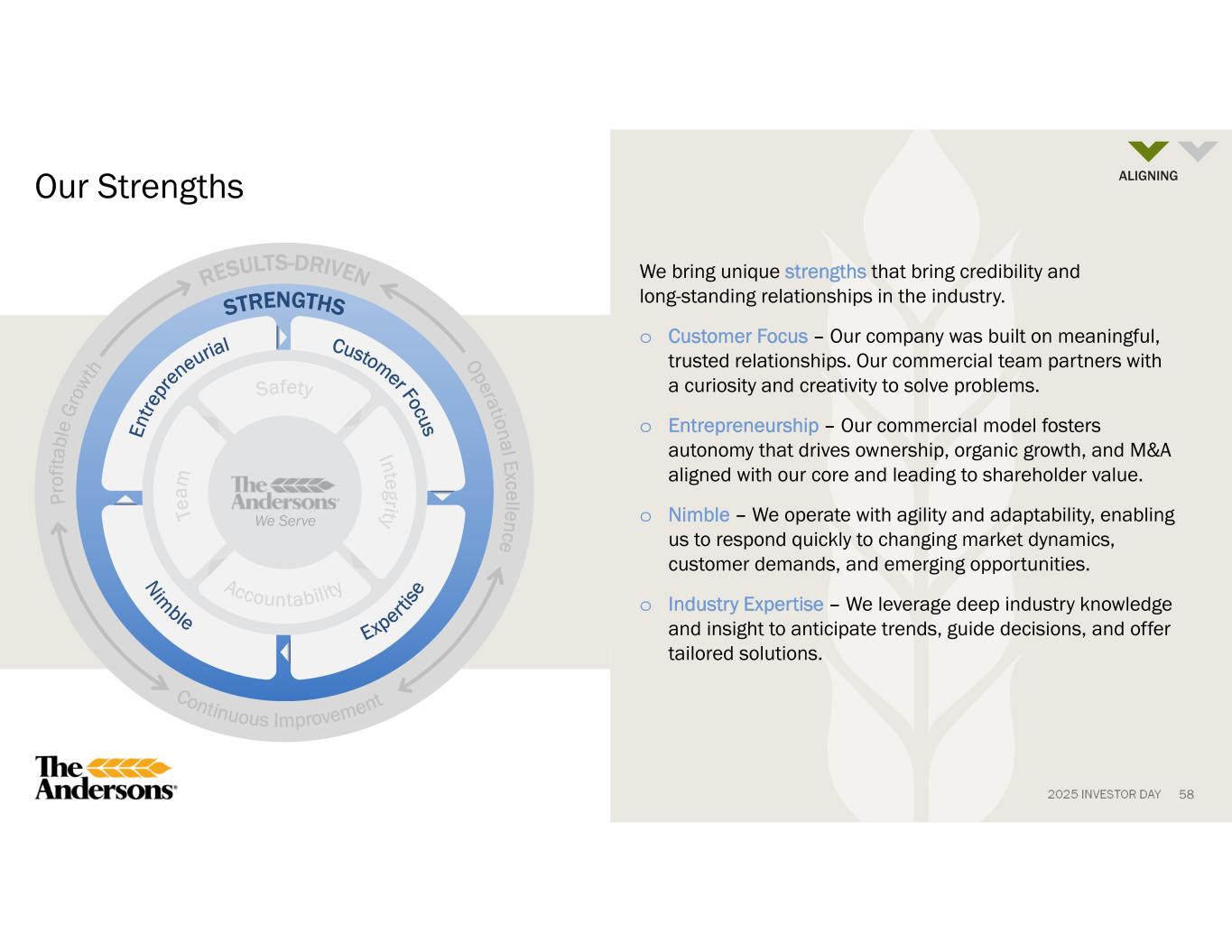 2025 INVESTOR DAY 57 Our Commitments Our shared commitments provide clear expectations on the Anderson’s core values, behavioral norms, and operating principles. o Team – We believe in the strength of collaboration, respecting diverse perspectives, and working together to achieve shared goals to create lasting value. o Integrity – A foundation in our character since 1947. We act with honesty and transparency. Regardless of the circumstance, we do the right thing. o Accountability – We take ownership of our actions, decision, and outcomes, holding ourselves responsible to deliver on commitments and striving for excellence in everything we do. o Safety – We hold ourselves to a standard far beyond simple compliance. Safety defines our culture and is embedded in every decision we make. We Serve ALIGNING