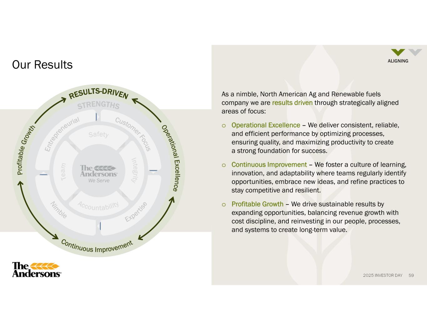 2025 INVESTOR DAY 59 Our Results As a nimble, North American Ag and Renewable fuels company we are results driven through strategically aligned areas of focus: o Operational Excellence – We deliver consistent, reliable, and efficient performance by optimizing processes, ensuring quality, and maximizing productivity to create a strong foundation for success. o Continuous Improvement – We foster a culture of learning, innovation, and adaptability where teams regularly identify opportunities, embrace new ideas, and refine practices to stay competitive and resilient. o Profitable Growth – We drive sustainable results by expanding opportunities, balancing revenue growth with cost discipline, and reinvesting in our people, processes, and systems to create long-term value. We Serve ALIGNING