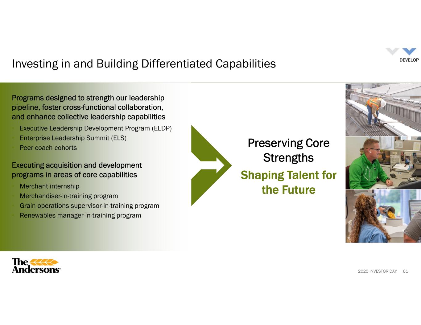 2025 INVESTOR DAY 61 Investing in and Building Differentiated Capabilities Preserving Core Strengths Shaping Talent for the Future Programs designed to strength our leadership pipeline, foster cross-functional collaboration, and enhance collective leadership capabilities • Executive Leadership Development Program (ELDP) • Enterprise Leadership Summit (ELS) • Peer coach cohorts Executing acquisition and development programs in areas of core capabilities • Merchant internship • Merchandiser-in-training program • Grain operations supervisor-in-training program • Renewables manager-in-training program DEVELOP