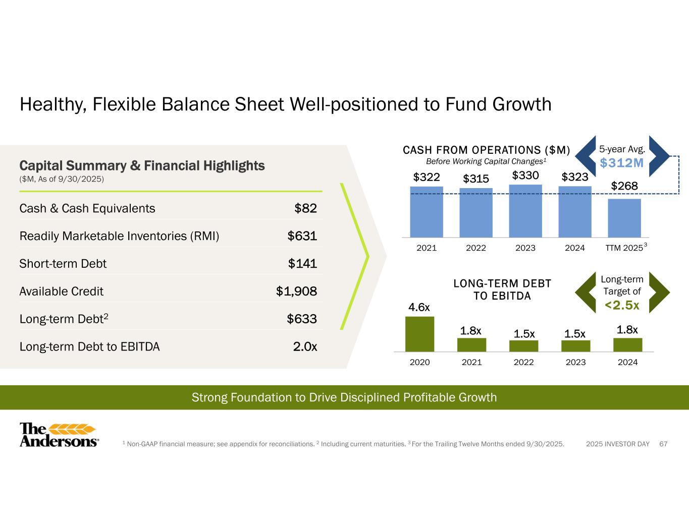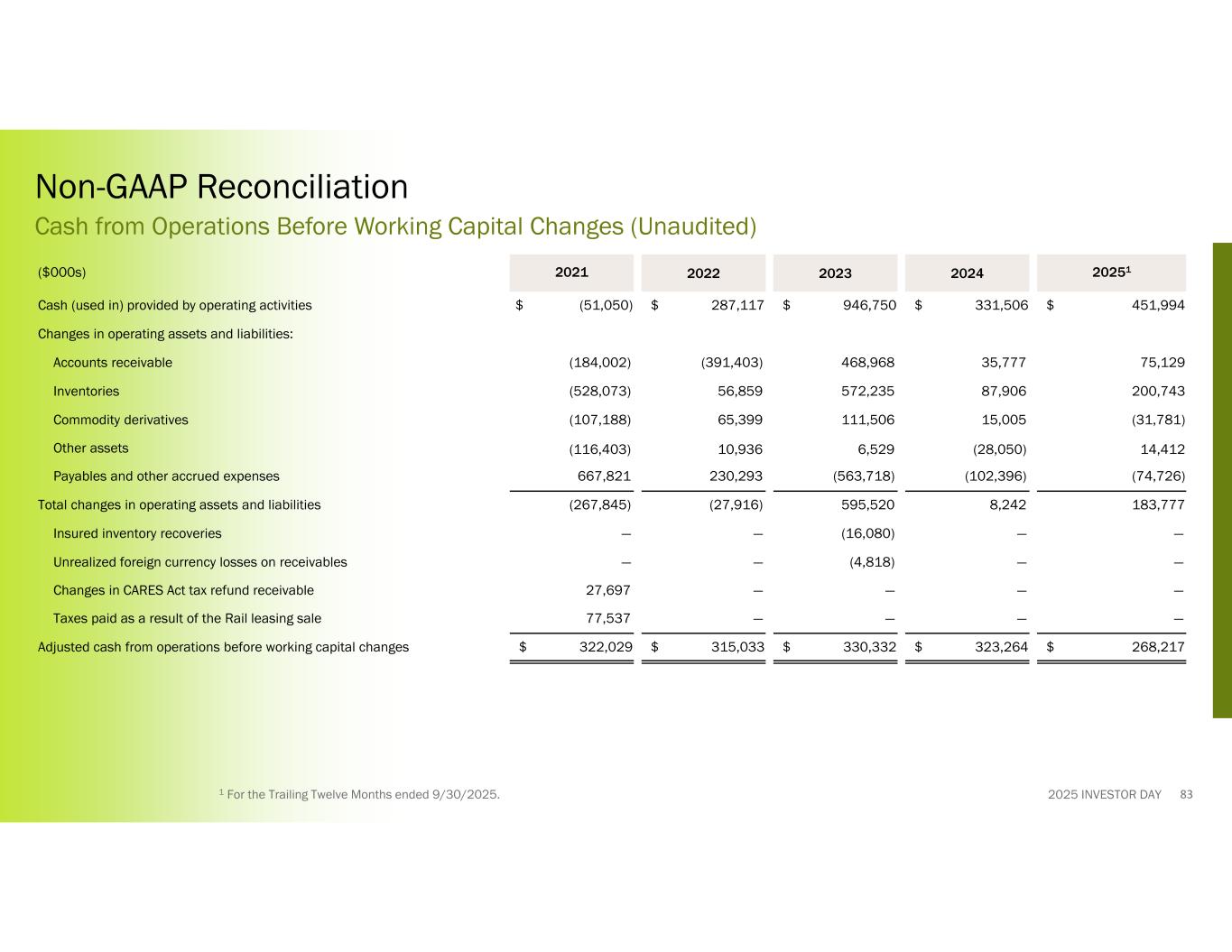 2025 INVESTOR DAY1 For the Trailing Twelve Months ended 9/30/2025. Non-GAAP Reconciliation Cash from Operations Before Working Capital Changes (Unaudited) 202512024202320222021($000s) $ 451,994$ 331,506$ 946,750$ 287,117$ (51,050)Cash (used in) provided by operating activities Changes in operating assets and liabilities: 75,12935,777468,968(391,403)(184,002)Accounts receivable 200,74387,906572,23556,859(528,073)Inventories (31,781)15,005111,50665,399(107,188)Commodity derivatives 14,412(28,050)6,52910,936(116,403)Other assets (74,726)(102,396)(563,718)230,293667,821Payables and other accrued expenses 183,7778,242595,520(27,916)(267,845)Total changes in operating assets and liabilities ——(16,080)——Insured inventory recoveries ——(4,818)——Unrealized foreign currency losses on receivables ————27,697Changes in CARES Act tax refund receivable ————77,537Taxes paid as a result of the Rail leasing sale $ 268,217$ 323,264$ 330,332$ 315,033$ 322,029Adjusted cash from operations before working capital changes 83