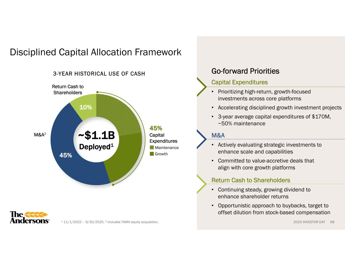 2025 INVESTOR DAY1 11/1/2022 – 9/30/2025. 2 Includes TAMH equity acquisition. Disciplined Capital Allocation Framework 45% 10% 3-YEAR HISTORICAL USE OF CASH ~$1.1B Deployed1 Go-forward Priorities Return Cash to Shareholders 45% Capital Expenditures Maintenance Growth M&A2 Capital Expenditures • Prioritizing high-return, growth-focused investments across core platforms • Accelerating disciplined growth investment projects • 3-year average capital expenditures of $170M, ~50% maintenance M&A • Actively evaluating strategic investments to enhance scale and capabilities • Committed to value-accretive deals that align with core growth platforms Return Cash to Shareholders • Continuing steady, growing dividend to enhance shareholder returns • Opportunistic approach to buybacks, target to offset dilution from stock-based compensation 68