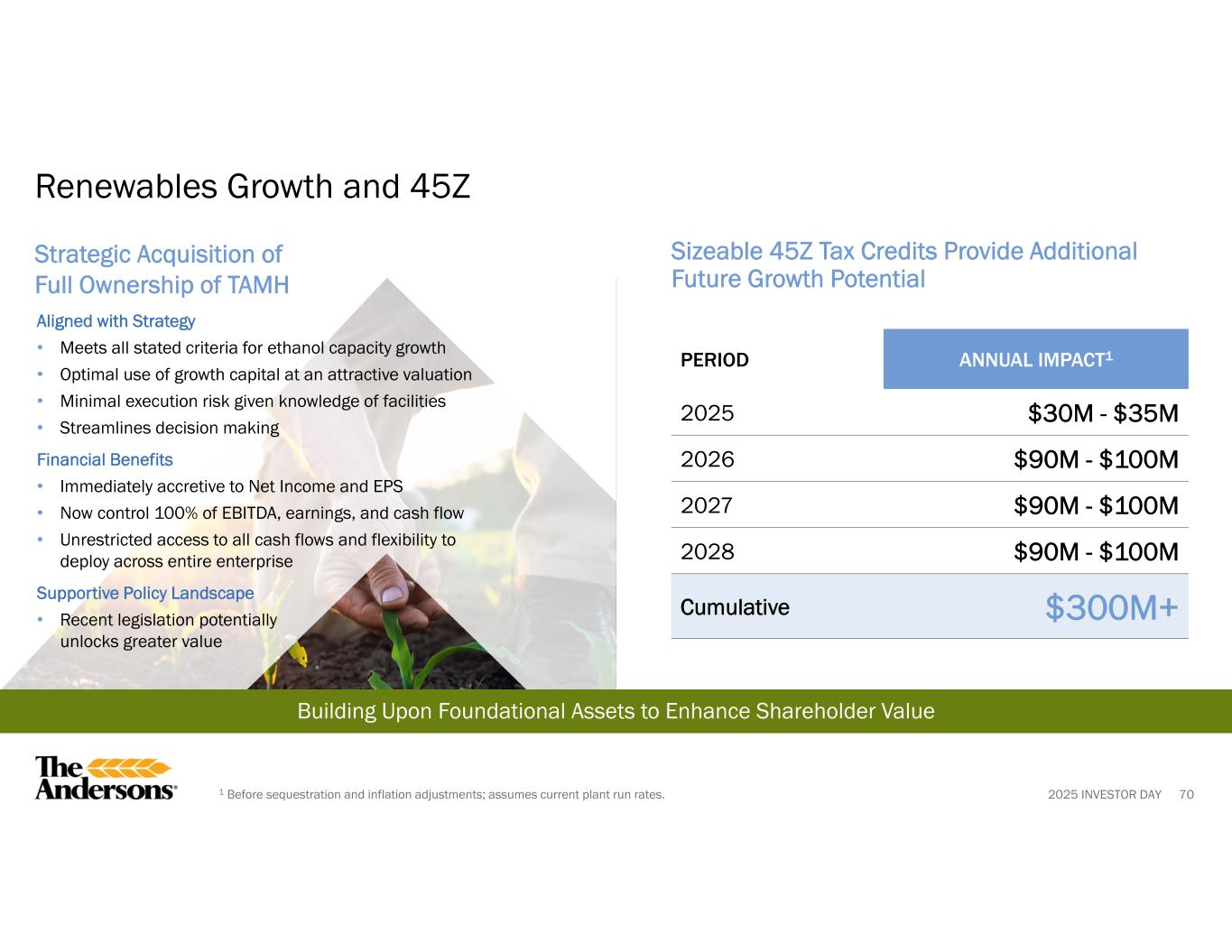 2025 INVESTOR DAY $100M of incremental cash/EBITDA from tax credits Strategic Acquisition of Full Ownership of TAMH Sizeable 45Z Tax Credits Provide Additional Future Growth Potential 701 Before sequestration and inflation adjustments; assumes current plant run rates. Renewables Growth and 45Z Building Upon Foundational Assets to Enhance Shareholder Value Aligned with Strategy • Meets all stated criteria for ethanol capacity growth • Optimal use of growth capital at an attractive valuation • Minimal execution risk given knowledge of facilities • Streamlines decision making Financial Benefits • Immediately accretive to Net Income and EPS • Now control 100% of EBITDA, earnings, and cash flow • Unrestricted access to all cash flows and flexibility to deploy across entire enterprise Supportive Policy Landscape • Recent legislation potentially unlocks greater value ANNUAL IMPACT1PERIOD $30M - $35M2025 $90M - $100M2026 $90M - $100M2027 $90M - $100M2028 $300M+Cumulative