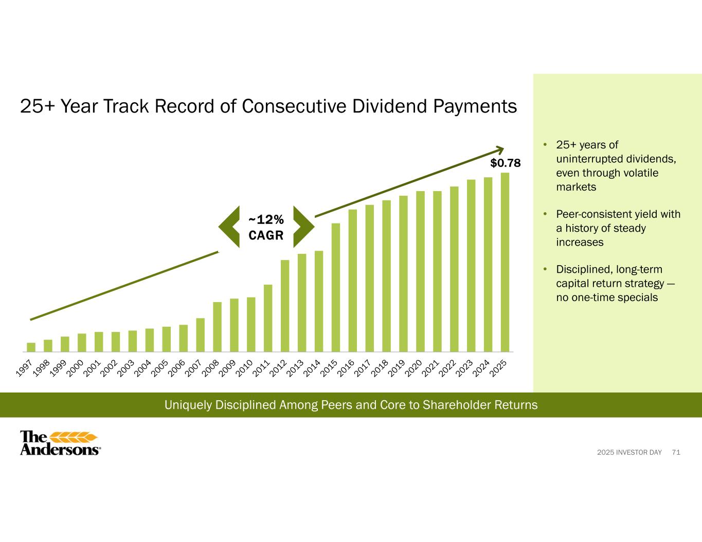 2025 INVESTOR DAY 71 Uniquely Disciplined Among Peers and Core to Shareholder Returns 25+ Year Track Record of Consecutive Dividend Payments $0.78 • 25+ years of uninterrupted dividends, even through volatile markets • Peer-consistent yield with a history of steady increases • Disciplined, long-term capital return strategy — no one-time specials ~12% CAGR