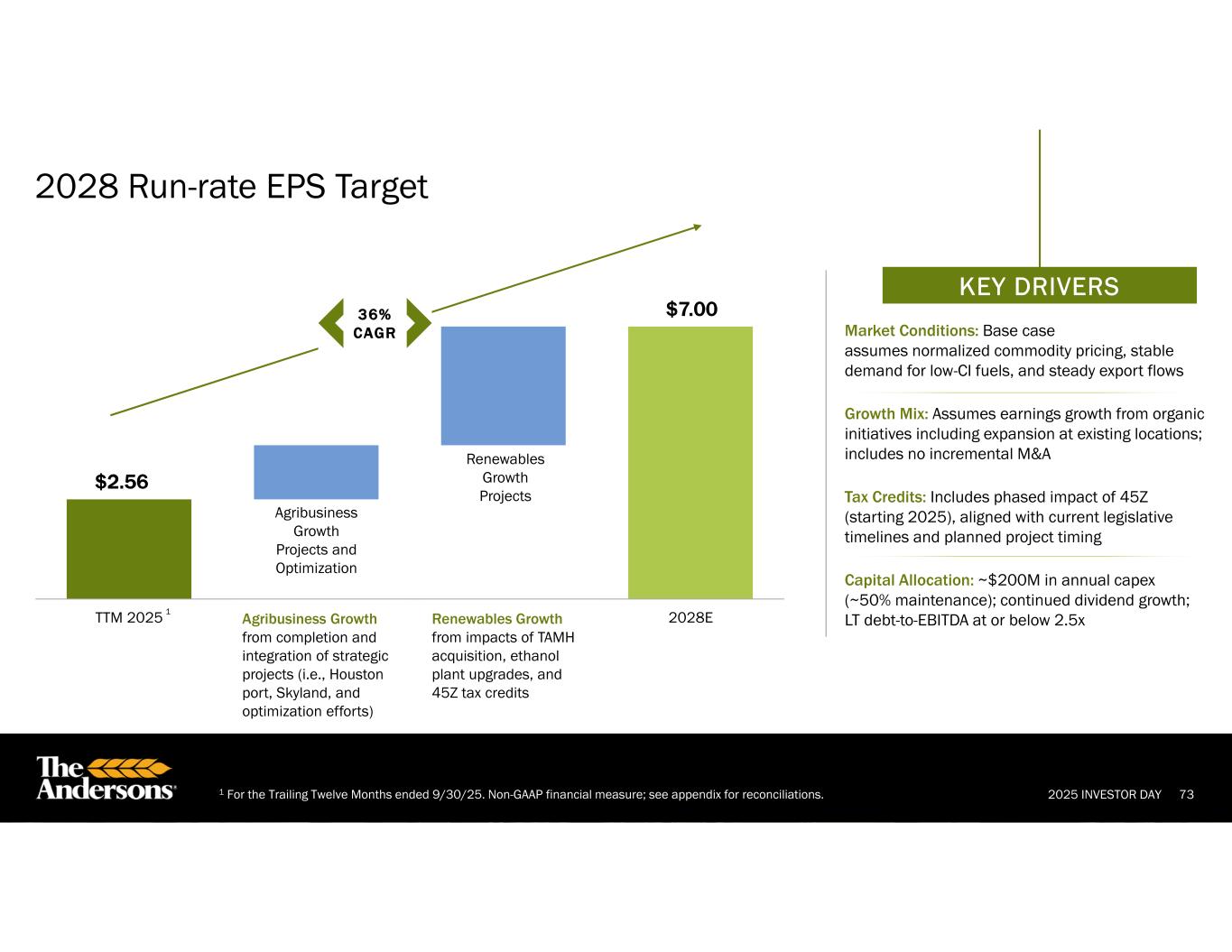 2025 INVESTOR DAY 731 For the Trailing Twelve Months ended 9/30/25. Non-GAAP financial measure; see appendix for reconciliations. 2028 Run-rate EPS Target TTM 2025 2028E Agribusiness Growth Projects and Optimization $2.56 $7.00 Renewables Growth Projects KEY DRIVERS 36% CAGR Market Conditions: Base case assumes normalized commodity pricing, stable demand for low-CI fuels, and steady export flows Growth Mix: Assumes earnings growth from organic initiatives including expansion at existing locations; includes no incremental M&A Tax Credits: Includes phased impact of 45Z (starting 2025), aligned with current legislative timelines and planned project timing Capital Allocation: ~$200M in annual capex (~50% maintenance); continued dividend growth; LT debt-to-EBITDA at or below 2.5xRenewables Growth from impacts of TAMH acquisition, ethanol plant upgrades, and 45Z tax credits Agribusiness Growth from completion and integration of strategic projects (i.e., Houston port, Skyland, and optimization efforts) 1