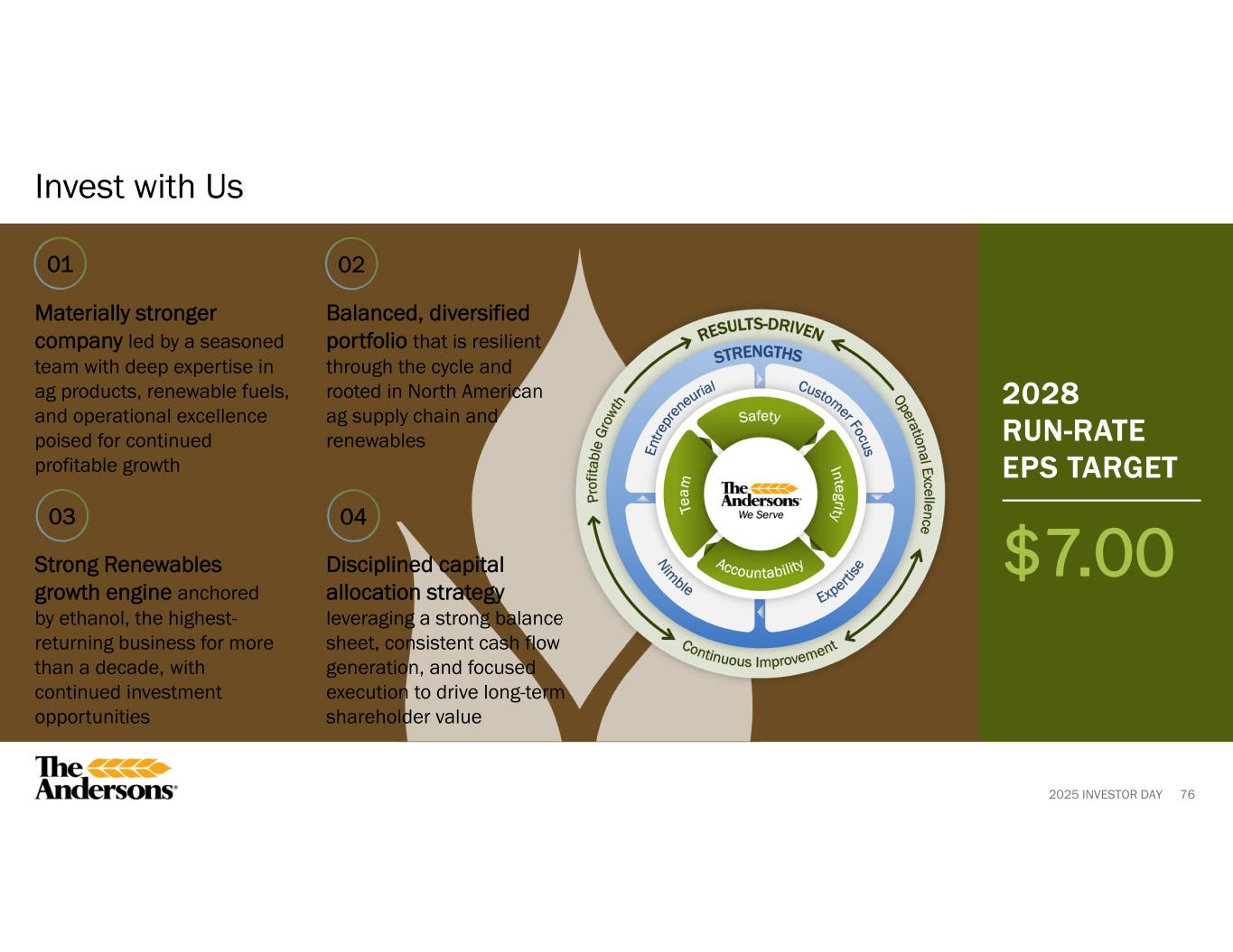 2025 INVESTOR DAY 01 02 03 Key Takeaways 74 Delivering better and more resilient performance through various ag cycles with improved earnings stability and a well-balanced, diversified portfolio Generating strong cash flow from operations as we execute growth projects, optimize margins and centralize enterprise functions Prioritizing long-term value creation and balance sheet strength through disciplined, responsible capital allocation