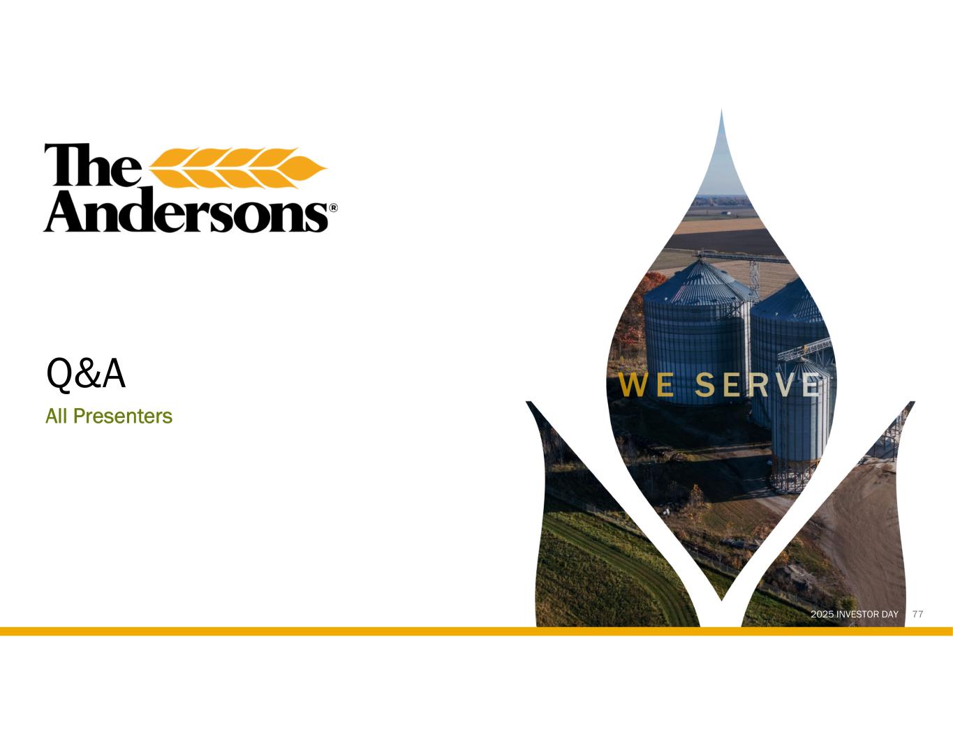 2025 INVESTOR DAY 76 Invest with Us Materially stronger company led by a seasoned team with deep expertise in ag products, renewable fuels, and operational excellence poised for continued profitable growth Strong Renewables growth engine anchored by ethanol, the highest- returning business for more than a decade, with continued investment opportunities 01 03 Balanced, diversified portfolio that is resilient through the cycle and rooted in North American ag supply chain and renewables Disciplined capital allocation strategy leveraging a strong balance sheet, consistent cash flow generation, and focused execution to drive long-term shareholder value 02 04 2028 RUN-RATE EPS TARGET $7.00