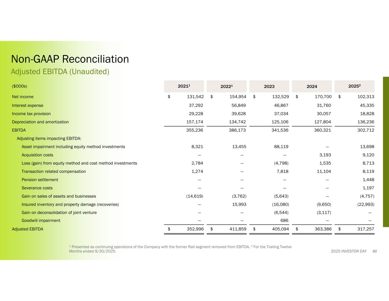 2025 INVESTOR DAY 1 Presented as continuing operations of the Company with the former Rail segment removed from EBITDA. 2 For the Trailing Twelve Months ended 9/30/2025. Non-GAAP Reconciliation Adjusted EBITDA (Unaudited) 20252202420232022120211($000s) $ 102,313$ 170,700$ 132,529$ 154,954$ 131,542Net income 45,33531,76046,86756,84937,292Interest expense 18,82830,05737,03439,62829,228Income tax provision 136,236127,804125,106134,742157,174Depreciation and amortization 302,712360,321341,536386,173355,236EBITDA Adjusting items impacting EBITDA: 13,698—88,11913,4558,321Asset impairment including equity method investments 9,1203,193———Acquisition costs 8,7131,535(4,798)—2,784Loss (gain) from equity method and cost method investments 8,11911,1047,818—1,274Transaction related compensation 1,448————Pension settlement 1,197————Severance costs (4,757)—(5,643)(3,762)(14,619)Gain on sales of assets and businesses (22,993)(9,650)(16,080)15,993—Insured inventory and property damage (recoveries) —(3,117)(6,544)——Gain on deconsolidation of joint venture ——686——Goodwill impairment $ 317,257$ 363,386$ 405,094$ 411,859$ 352,996Adjusted EBITDA 80