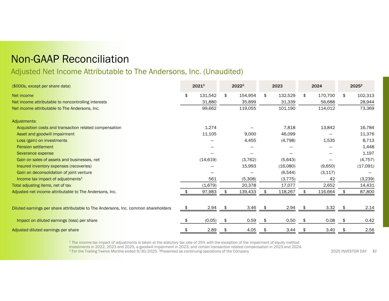 2025 INVESTOR DAY 20252202420232022320213($000s, except per share data) $ 102,313$ 170,700$ 132,529$ 154,954$ 131,542Net income 28,94456,68831,33935,89931,880Net income attributable to noncontrolling interests 73,369114,012101,190119,05599,662Net income attributable to The Andersons, Inc. Adjustments: 16,78413,8427,818—1,274Acquisition costs and transaction related compensation 11,376—46,0999,00011,105Asset and goodwill impairment 8,7131,535(4,798)4,455—Loss (gain) on investments 1,448————Pension settlement 1,197————Severance expense (4,757)—(5,643)(3,762)(14,619)Gain on sales of assets and businesses, net (17,091)(9,650)(16,080)15,993—Insured inventory expenses (recoveries) —(3,117)(6,544)——Gain on deconsolidation of joint venture (3,239)42(3,775)(5,308)561Income tax impact of adjustments1 14,4312,65217,07720,378(1,679)Total adjusting items, net of tax $ 87,800$ 116,664$ 118,267$ 139,433$ 97,983Adjusted net income attributable to The Andersons, Inc. $ 2.14$ 3.32$ 2.94$ 3.46$ 2.94Diluted earnings per share attributable to The Andersons, Inc. common shareholders $ 0.42$ 0.08$ 0.50$ 0.59$ (0.05)Impact on diluted earnings (loss) per share $ 2.56$ 3.40$ 3.44$ 4.05$ 2.89Adjusted diluted earnings per share 82 1 The income tax impact of adjustments is taken at the statutory tax rate of 25% with the exception of the impairment of equity method investments in 2022, 2023 and 2025, a goodwill impairment in 2023, and certain transaction related compensation in 2023 and 2024. 2 For the Trailing Twelve Months ended 9/30/2025. 3Presented as continuing operations of the Company Non-GAAP Reconciliation Adjusted Net Income Attributable to The Andersons, Inc. (Unaudited)