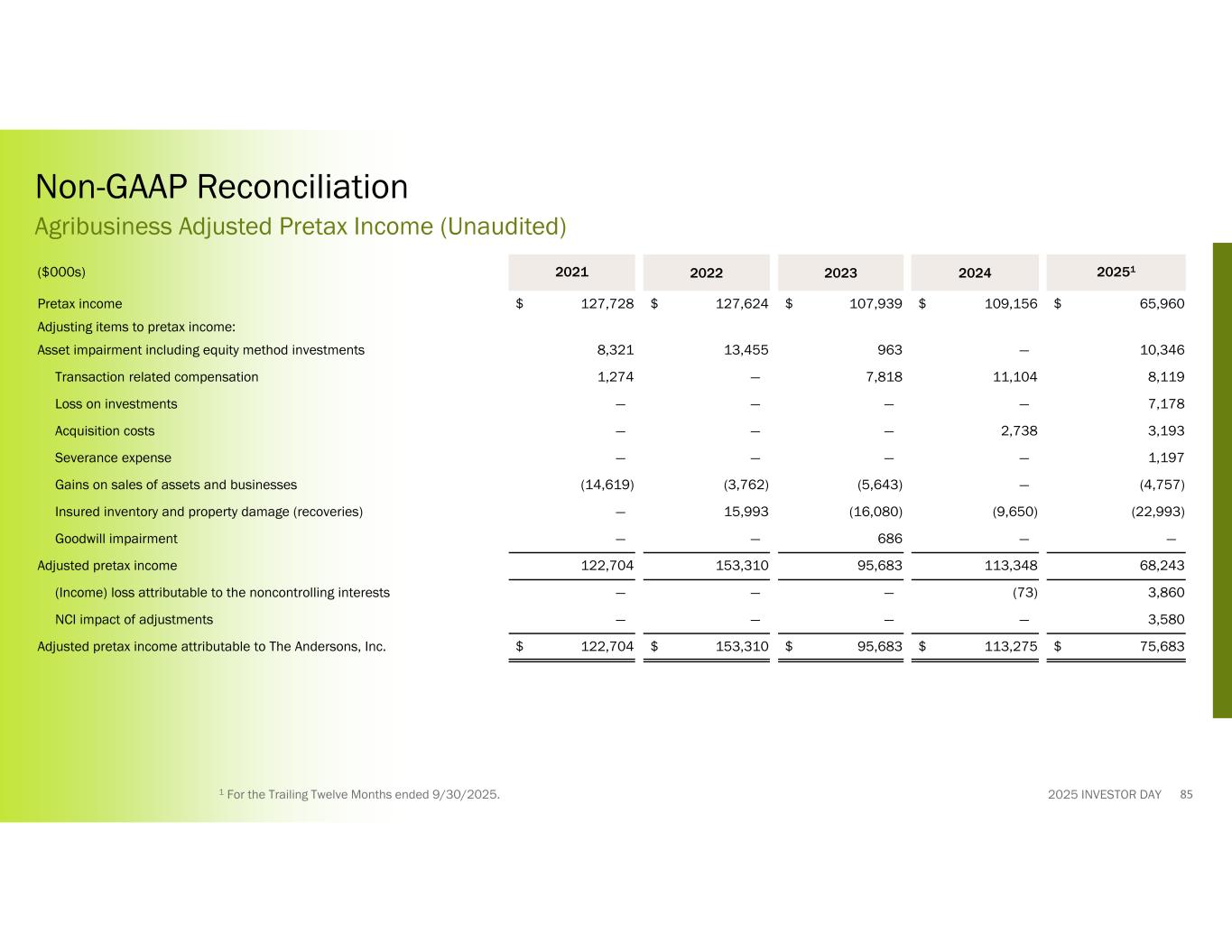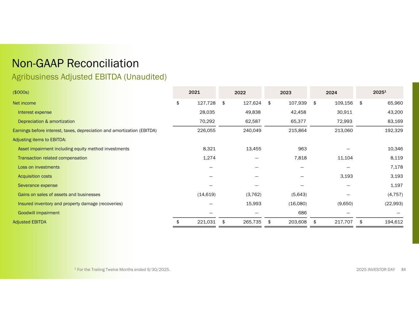 2025 INVESTOR DAY 202512024202320222021($000s) $ 65,960$ 109,156$ 107,939$ 127,624$ 127,728Net income 43,20030,91142,45849,83828,035Interest expense 83,16972,99365,37762,58770,292Depreciation & amortization 192,329213,060215,864240,049226,055Earnings before interest, taxes, depreciation and amortization (EBITDA) Adjusting items to EBITDA: 10,346—96313,4558,321Asset impairment including equity method investments 8,11911,1047,818—1,274Transaction related compensation 7,178————Loss on investments 3,1933,193———Acquisition costs 1,197————Severance expense (4,757)—(5,643)(3,762)(14,619)Gains on sales of assets and businesses (22,993)(9,650)(16,080)15,993—Insured inventory and property damage (recoveries) ——686——Goodwill impairment $ 194,612$ 217,707$ 203,608$ 265,735$ 221,031Adjusted EBITDA 1 For the Trailing Twelve Months ended 9/30/2025. Non-GAAP Reconciliation Agribusiness Adjusted EBITDA (Unaudited) 84