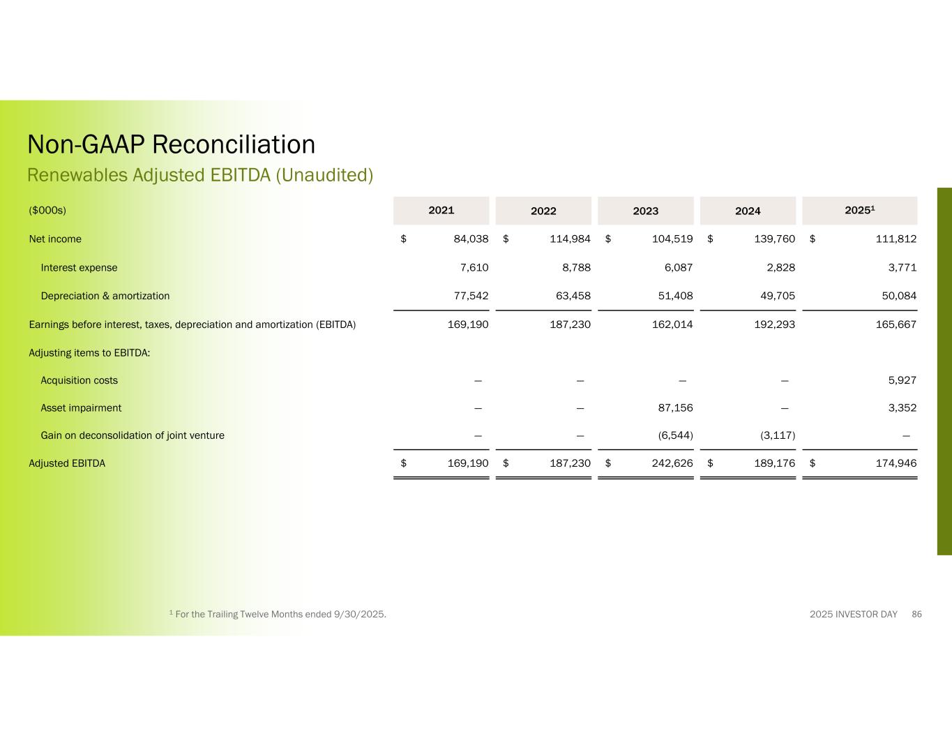 2025 INVESTOR DAY 202512024202320222021($000s) $ 111,812$ 139,760$ 104,519$ 114,984$ 84,038Net income 3,7712,8286,0878,7887,610Interest expense 50,08449,70551,40863,45877,542Depreciation & amortization 165,667192,293162,014187,230169,190Earnings before interest, taxes, depreciation and amortization (EBITDA) Adjusting items to EBITDA: 5,927————Acquisition costs 3,352—87,156——Asset impairment —(3,117)(6,544)——Gain on deconsolidation of joint venture $ 174,946$ 189,176$ 242,626$ 187,230$ 169,190Adjusted EBITDA Non-GAAP Reconciliation Renewables Adjusted EBITDA (Unaudited) 861 For the Trailing Twelve Months ended 9/30/2025.