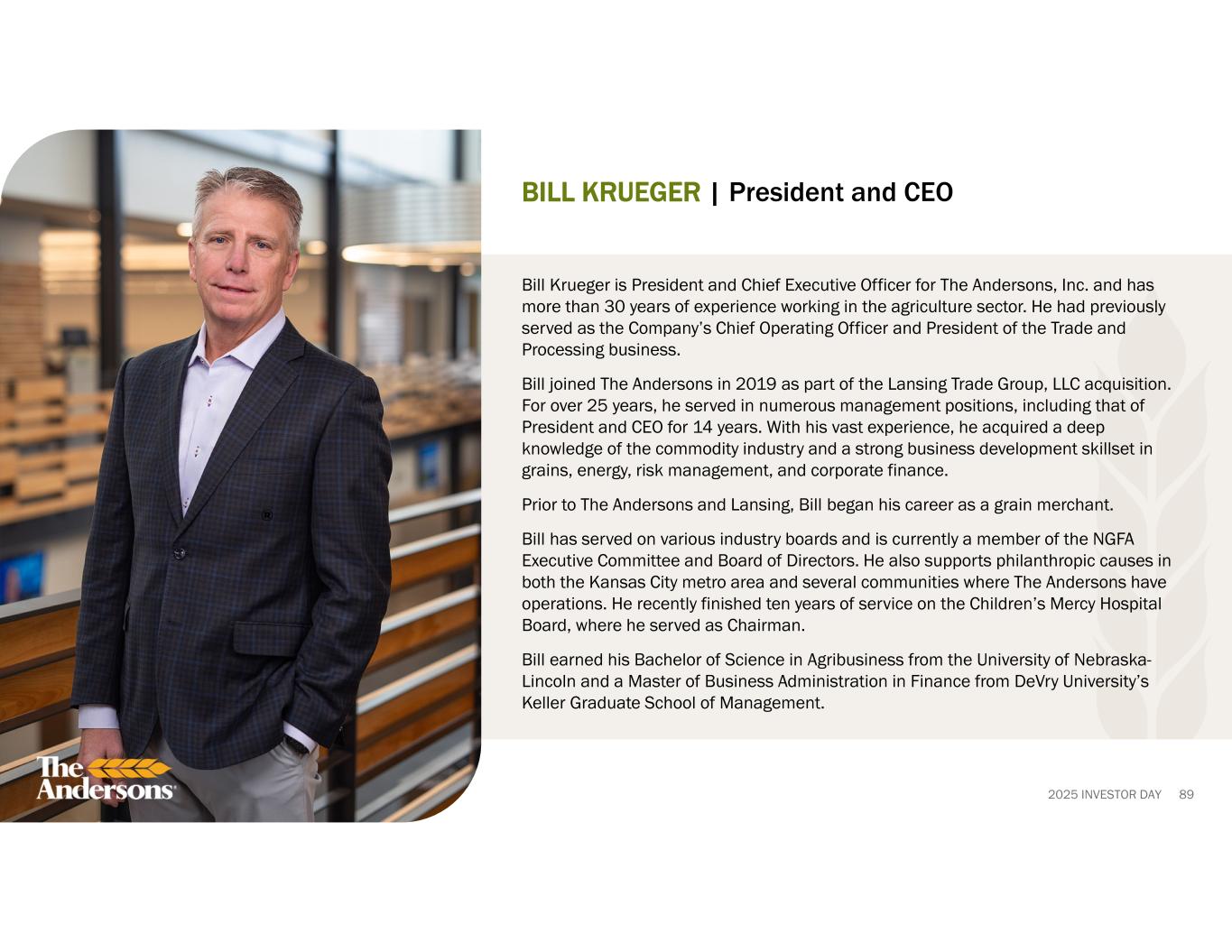 2025 INVESTOR DAY 89 BILL KRUEGER | President and CEO Bill Krueger is President and Chief Executive Officer for The Andersons, Inc. and has more than 30 years of experience working in the agriculture sector. He had previously served as the Company’s Chief Operating Officer and President of the Trade and Processing business. Bill joined The Andersons in 2019 as part of the Lansing Trade Group, LLC acquisition. For over 25 years, he served in numerous management positions, including that of President and CEO for 14 years. With his vast experience, he acquired a deep knowledge of the commodity industry and a strong business development skillset in grains, energy, risk management, and corporate finance. Prior to The Andersons and Lansing, Bill began his career as a grain merchant. Bill has served on various industry boards and is currently a member of the NGFA Executive Committee and Board of Directors. He also supports philanthropic causes in both the Kansas City metro area and several communities where The Andersons have operations. He recently finished ten years of service on the Children’s Mercy Hospital Board, where he served as Chairman. Bill earned his Bachelor of Science in Agribusiness from the University of Nebraska- Lincoln and a Master of Business Administration in Finance from DeVry University’s Keller Graduate School of Management.