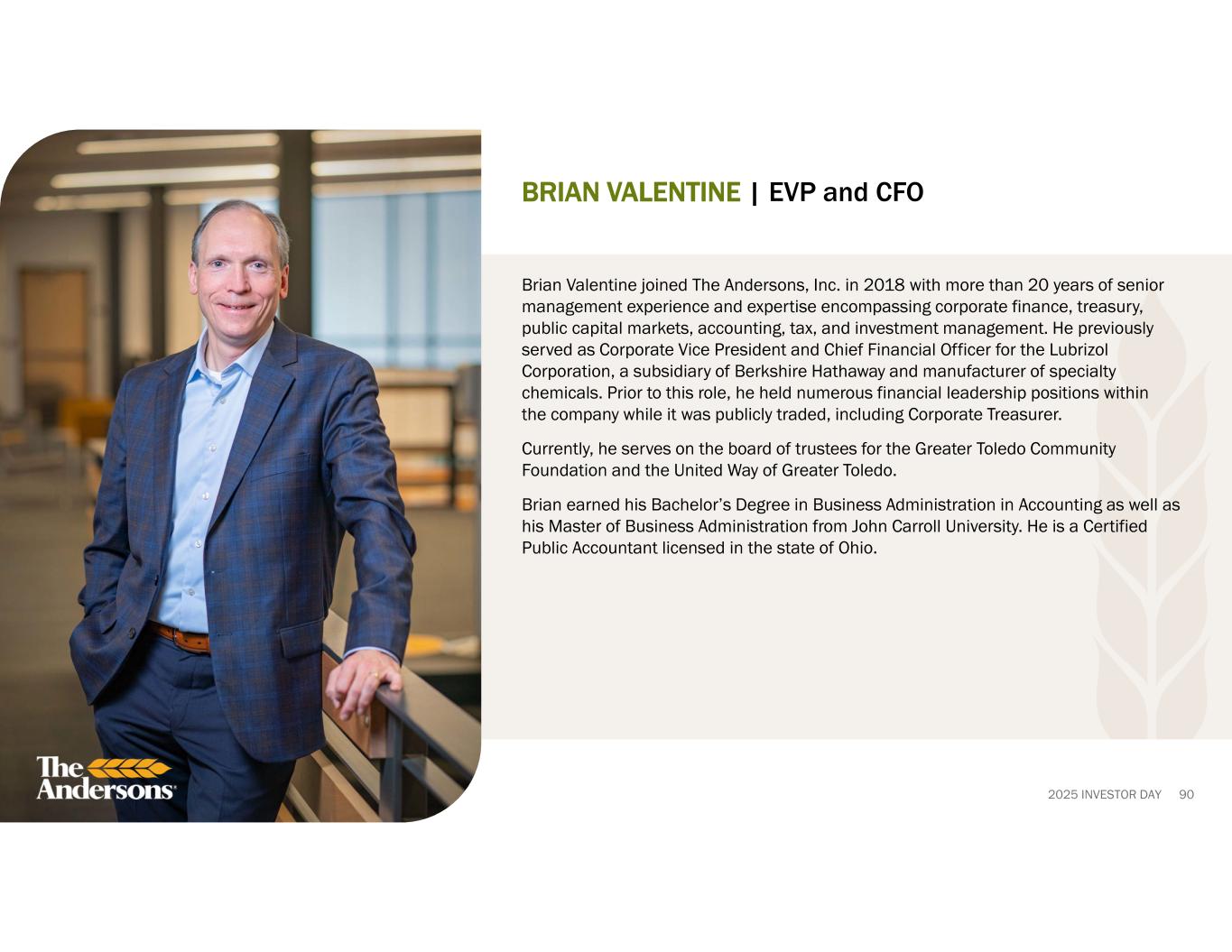 2025 INVESTOR DAY 90 BRIAN VALENTINE | EVP and CFO Brian Valentine joined The Andersons, Inc. in 2018 with more than 20 years of senior management experience and expertise encompassing corporate finance, treasury, public capital markets, accounting, tax, and investment management. He previously served as Corporate Vice President and Chief Financial Officer for the Lubrizol Corporation, a subsidiary of Berkshire Hathaway and manufacturer of specialty chemicals. Prior to this role, he held numerous financial leadership positions within the company while it was publicly traded, including Corporate Treasurer. Currently, he serves on the board of trustees for the Greater Toledo Community Foundation and the United Way of Greater Toledo. Brian earned his Bachelor’s Degree in Business Administration in Accounting as well as his Master of Business Administration from John Carroll University. He is a Certified Public Accountant licensed in the state of Ohio.
