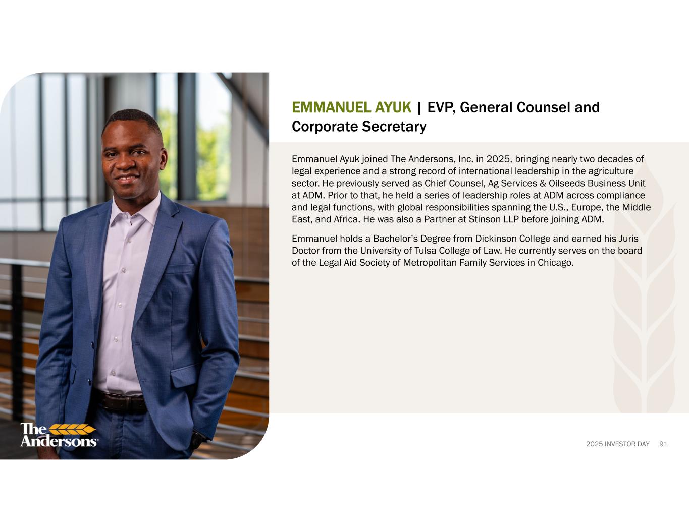 2025 INVESTOR DAY 91 EMMANUEL AYUK | EVP, General Counsel and Corporate Secretary Emmanuel Ayuk joined The Andersons, Inc. in 2025, bringing nearly two decades of legal experience and a strong record of international leadership in the agriculture sector. He previously served as Chief Counsel, Ag Services & Oilseeds Business Unit at ADM. Prior to that, he held a series of leadership roles at ADM across compliance and legal functions, with global responsibilities spanning the U.S., Europe, the Middle East, and Africa. He was also a Partner at Stinson LLP before joining ADM. Emmanuel holds a Bachelor’s Degree from Dickinson College and earned his Juris Doctor from the University of Tulsa College of Law. He currently serves on the board of the Legal Aid Society of Metropolitan Family Services in Chicago.