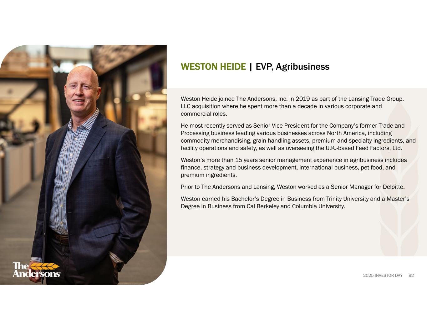 2025 INVESTOR DAY 92 WESTON HEIDE | EVP, Agribusiness Weston Heide joined The Andersons, Inc. in 2019 as part of the Lansing Trade Group, LLC acquisition where he spent more than a decade in various corporate and commercial roles. He most recently served as Senior Vice President for the Company’s former Trade and Processing business leading various businesses across North America, including commodity merchandising, grain handling assets, premium and specialty ingredients, and facility operations and safety, as well as overseeing the U.K.-based Feed Factors, Ltd. Weston’s more than 15 years senior management experience in agribusiness includes finance, strategy and business development, international business, pet food, and premium ingredients. Prior to The Andersons and Lansing, Weston worked as a Senior Manager for Deloitte. Weston earned his Bachelor’s Degree in Business from Trinity University and a Master’s Degree in Business from Cal Berkeley and Columbia University.