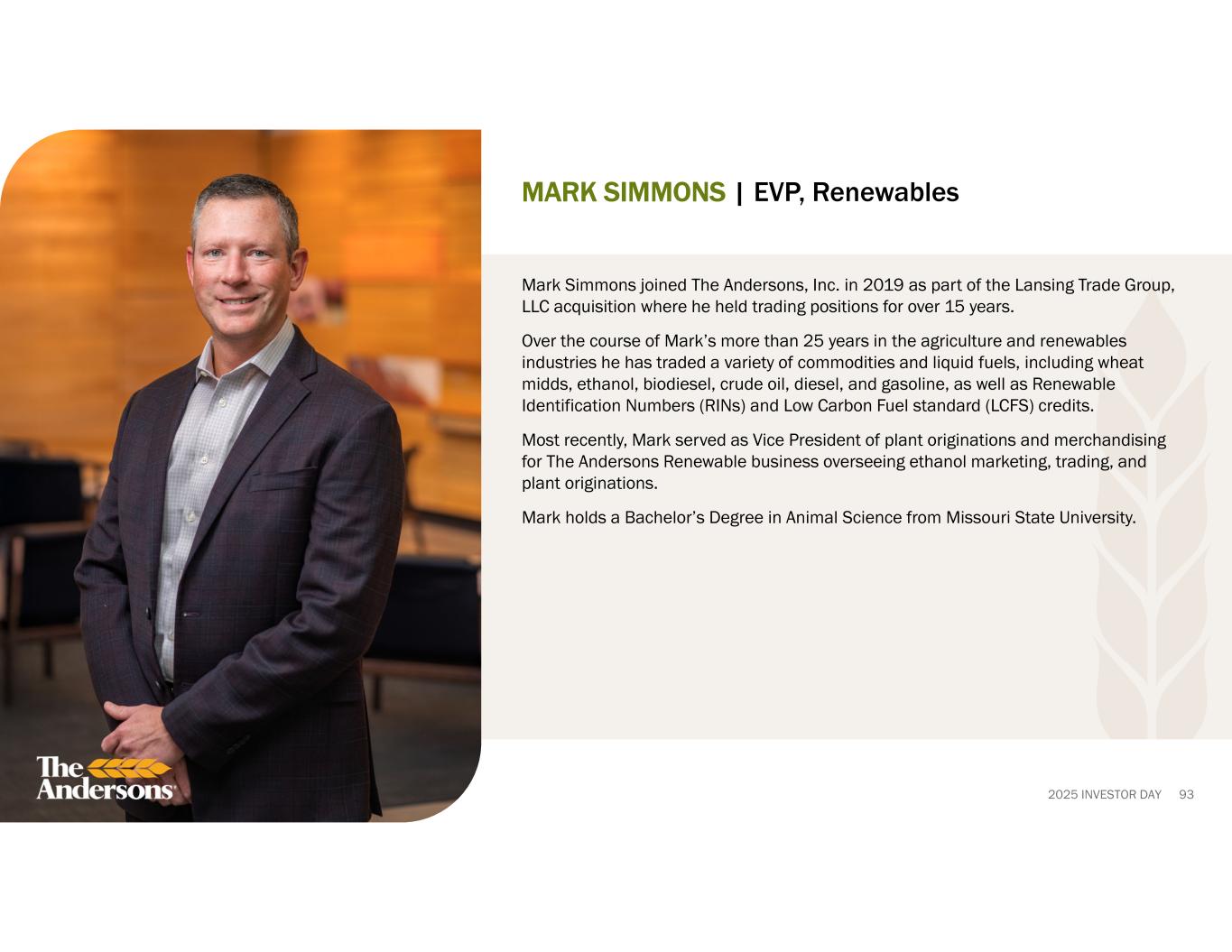 2025 INVESTOR DAY 93 MARK SIMMONS | EVP, Renewables Mark Simmons joined The Andersons, Inc. in 2019 as part of the Lansing Trade Group, LLC acquisition where he held trading positions for over 15 years. Over the course of Mark’s more than 25 years in the agriculture and renewables industries he has traded a variety of commodities and liquid fuels, including wheat midds, ethanol, biodiesel, crude oil, diesel, and gasoline, as well as Renewable Identification Numbers (RINs) and Low Carbon Fuel standard (LCFS) credits. Most recently, Mark served as Vice President of plant originations and merchandising for The Andersons Renewable business overseeing ethanol marketing, trading, and plant originations. Mark holds a Bachelor’s Degree in Animal Science from Missouri State University.
