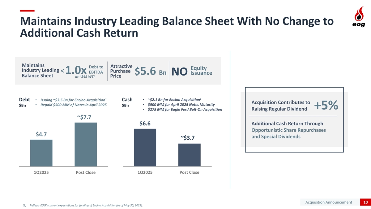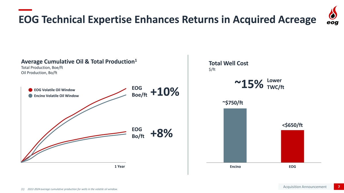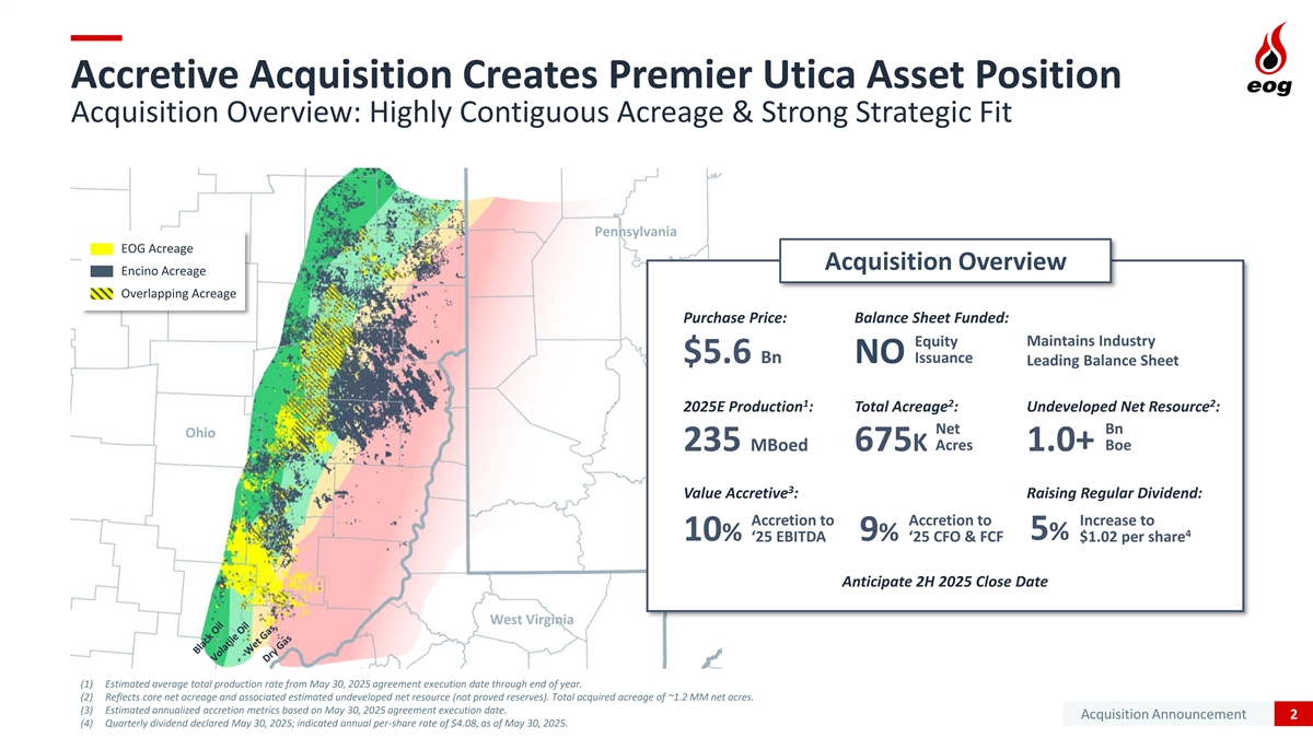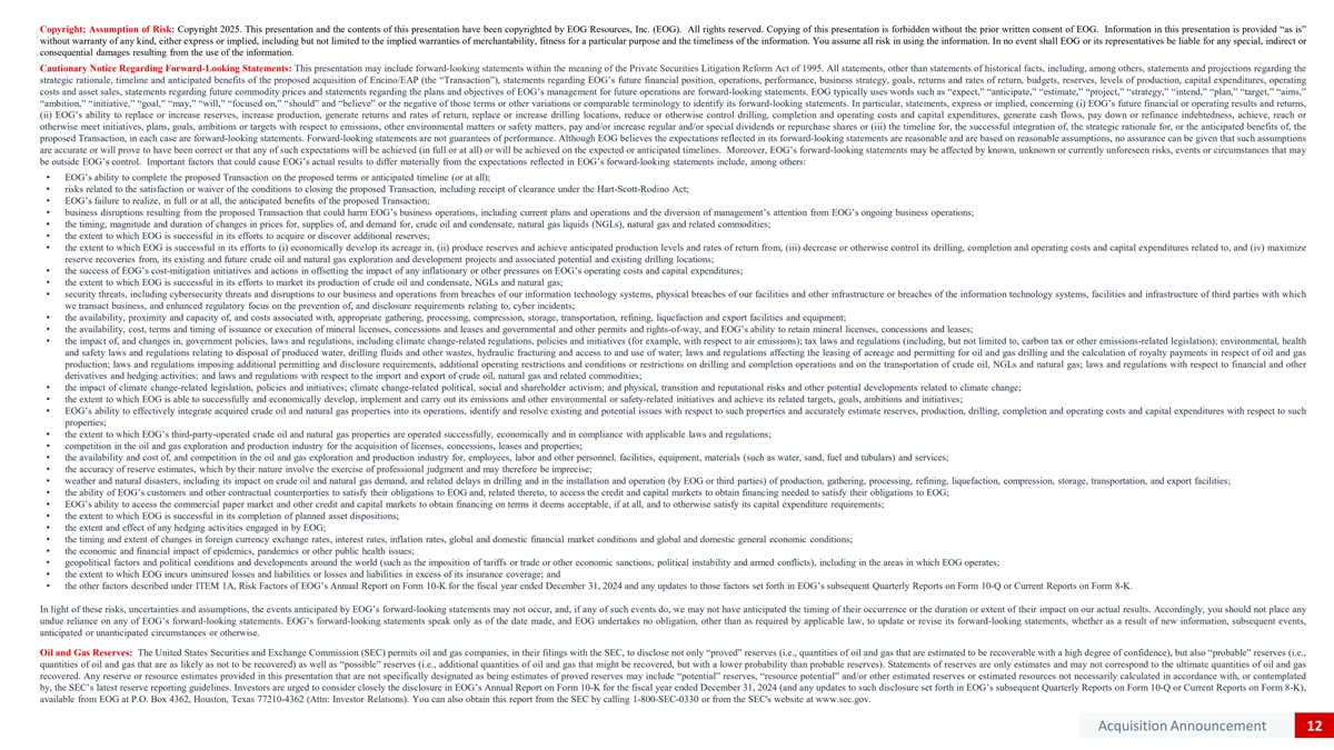 Copyright; Assumption of Risk: Copyright 2025. This presentation and the contents of this presentation have been copyrighted by EOG Resources, Inc. (EOG). All rights reserved. Copying of this presentation is forbidden without the prior written consent of EOG. Information in this presentation is provided “as is” without warranty of any kind, either express or implied, including but not limited to the implied warranties of merchantability, fitness for a particular purpose and the timeliness of the information. You assume all risk in using the information. In no event shall EOG or its representatives be liable for any special, indirect or consequential damages resulting from the use of the information. Cautionary Notice Regarding Forward-Looking Statements: This presentation may include forward-looking statements within the meaning of the Private Securities Litigation Reform Act of 1995. All statements, other than statements of historical facts, including, among others, statements and projections regarding the strategic rationale, timeline and anticipated benefits of the proposed acquisition of Encino/EAP (the “Transaction”), statements regarding EOG’s future financial position, operations, performance, business strategy, goals, returns and rates of return, budgets, reserves, levels of production, capital expenditures, operating costs and asset sales, statements regarding future commodity prices and statements regarding the plans and objectives of EOG’s management for future operations are forward‐looking statements. EOG typically uses words such as “expect,” “anticipate,” “estimate,” “project,” “strategy,” “intend,” “plan,” “target,” “aims,” “ambition,” “initiative,” “goal,” “may,” “will,” “focused on,” “should” and “believe” or the negative of those terms or other variations or comparable terminology to identify its forward‐looking statements. In particular, statements, express or implied, concerning (i) EOG’s future financial or operating results and returns, (ii) EOG’s ability to replace or increase reserves, increase production, generate returns and rates of return, replace or increase drilling locations, reduce or otherwise control drilling, completion and operating costs and capital expenditures, generate cash flows, pay down or refinance indebtedness, achieve, reach or otherwise meet initiatives, plans, goals, ambitions or targets with respect to emissions, other environmental matters or safety matters, pay and/or increase regular and/or special dividends or repurchase shares or (iii) the timeline for, the successful integration of, the strategic rationale for, or the anticipated benefits of, the proposed Transaction, in each case are forward‐looking statements. Forward-looking statements are not guarantees of performance. Although EOG believes the expectations reflected in its forward-looking statements are reasonable and are based on reasonable assumptions, no assurance can be given that such assumptions are accurate or will prove to have been correct or that any of such expectations will be achieved (in full or at all) or will be achieved on the expected or anticipated timelines. Moreover, EOG’s forward-looking statements may be affected by known, unknown or currently unforeseen risks, events or circumstances that may be outside EOG’s control. Important factors that could cause EOG’s actual results to differ materially from the expectations reflected in EOG’s forward-looking statements include, among others: •EOG’s ability to complete the proposed Transaction on the proposed terms or anticipated timeline (or at all); • risks related to the satisfaction or waiver of the conditions to closing the proposed Transaction, including receipt of clearance under the Hart-Scott-Rodino Act; •EOG’s failure to realize, in full or at all, the anticipated benefits of the proposed Transaction; • business disruptions resulting from the proposed Transaction that could harm EOG’s business operations, including current plans and operations and the diversion of management’s attention from EOG’s ongoing business operations; • the timing, magnitude and duration of changes in prices for, supplies of, and demand for, crude oil and condensate, natural gas liquids (NGLs), natural gas and related commodities; • the extent to which EOG is successful in its efforts to acquire or discover additional reserves; • the extent to which EOG is successful in its efforts to (i) economically develop its acreage in, (ii) produce reserves and achieve anticipated production levels and rates of return from, (iii) decrease or otherwise control its drilling, completion and operating costs and capital expenditures related to, and (iv) maximize reserve recoveries from, its existing and future crude oil and natural gas exploration and development projects and associated potential and existing drilling locations; • the success of EOG’s cost-mitigation initiatives and actions in offsetting the impact of any inflationary or other pressures on EOG’s operating costs and capital expenditures; • the extent to which EOG is successful in its efforts to market its production of crude oil and condensate, NGLs and natural gas; • security threats, including cybersecurity threats and disruptions to our business and operations from breaches of our information technology systems, physical breaches of our facilities and other infrastructure or breaches of the information technology systems, facilities and infrastructure of third parties with which we transact business, and enhanced regulatory focus on the prevention of, and disclosure requirements relating to, cyber incidents; • the availability, proximity and capacity of, and costs associated with, appropriate gathering, processing, compression, storage, transportation, refining, liquefaction and export facilities and equipment; • the availability, cost, terms 