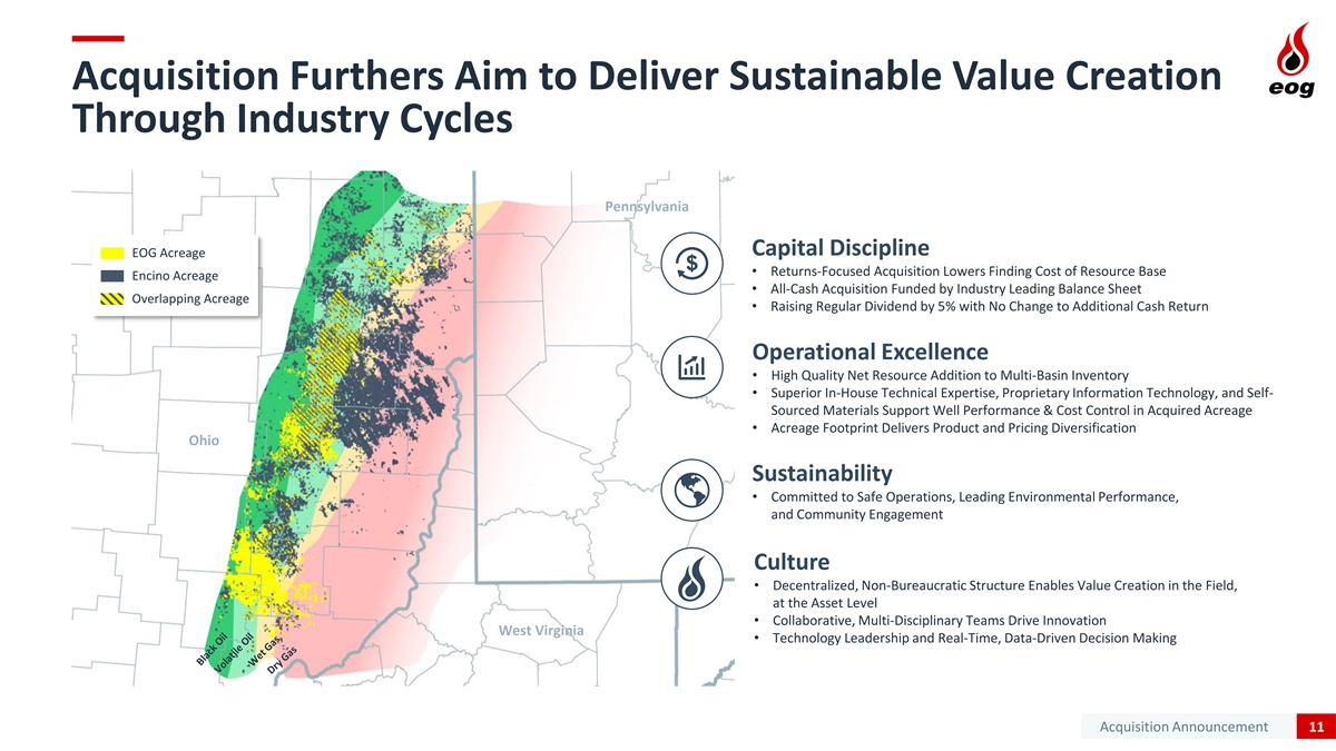 Maintains Industry Leading Balance Sheet With No Change to Additional Cash Return Maintains Attractive Debt to Equity Industry Leading < Purchase EBITDA 1.0x $5.6 Bn Issuance NO Balance Sheet at ~$45 WTI Price 1 1 • ~$2.1 Bn for Encino Acquisition Debt• Issuing ~$3.5 Bn for Encino Acquisition Cash Acquisition Contributes to • Repaid $500 MM of Notes in April 2025• $500 MM for April 2025 Notes Maturity $Bn $Bn +5% • $275 MM for Eagle Ford Bolt-On Acquisition Raising Regular Dividend ~$ $7 7. .7 7 $6.6 Additional Cash Return Through Opportunistic Share Repurchases $4.7 and Special Dividends ~$3.7 $4.0 1Q2025 Post Close 1Q2025 Post Close Acquisition Announcement 10 (1) Reflects EOG’s current expectations for funding of Encino Acquisition (as of May 30, 2025).