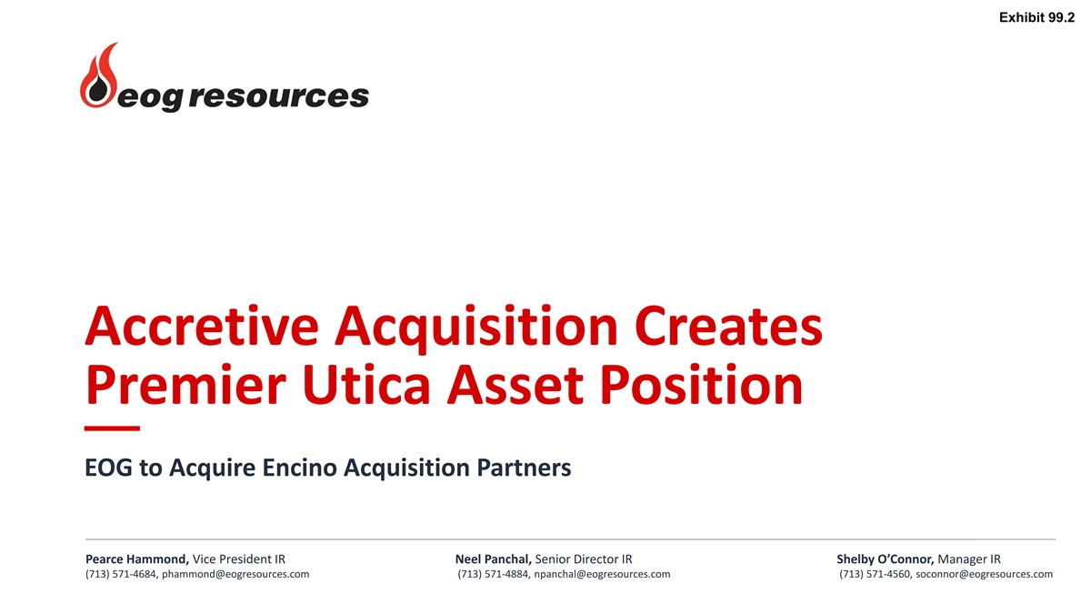 Exhibit 99.2 Accretive Acquisition Creates Premier Utica Asset Position EOG to Acquire Encino Acquisition Partners Pearce Hammond, Vice President IR Neel Panchal, Senior Director IR Shelby O’Connor, Manager IR (713) 571-4684, phammond@eogresources.com (713) 571-4884, npanchal@eogresources.com (713) 571-4560, soconnor@eogresources.com