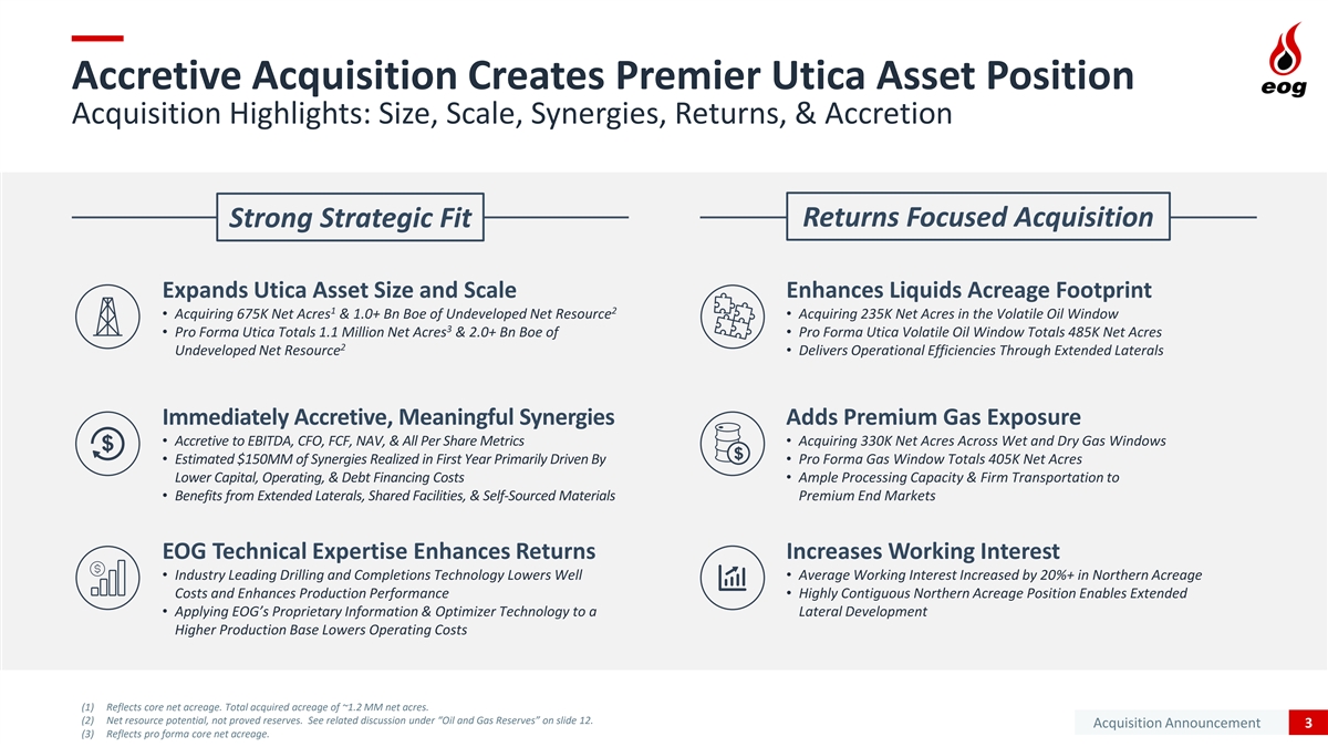 Accretive Acquisition Creates Premier Utica Asset Position Acquisition Overview: Highly Contiguous Acreage & Strong Strategic Fit Pennsylvania EOG Acreage Acquisition Overview Encino Acreage Overlapping Acreage Purchase Price: Balance Sheet Funded: Maintains Industry Equity $5.6 Bn NO Issuance Leading Balance Sheet 1 2 2 2025E Production : Total Acreage : Undeveloped Net Resource : Net Bn Ohio 235 MBoed 675K Acres 1.0+ Boe 3 Value Accretive : Raising Regular Dividend: Accretion to Accretion to Increase to 4 5% 10% 9% ‘25 EBITDA ‘25 CFO & FCF $1.02 per share Anticipate 2H 2025 Close Date West Virginia (1) Estimated average total production rate from May 30, 2025 agreement execution date through end of year. (2) Reflects core net acreage and associated estimated undeveloped net resource (not proved reserves). Total acquired acreage of ~1.2 MM net acres. (3) Estimated annualized accretion metrics based on May 30, 2025 agreement execution date. Acquisition Announcement 2 (4) Quarterly dividend declared May 30, 2025; indicated annual per-share rate of $4.08, as of May 30, 2025.