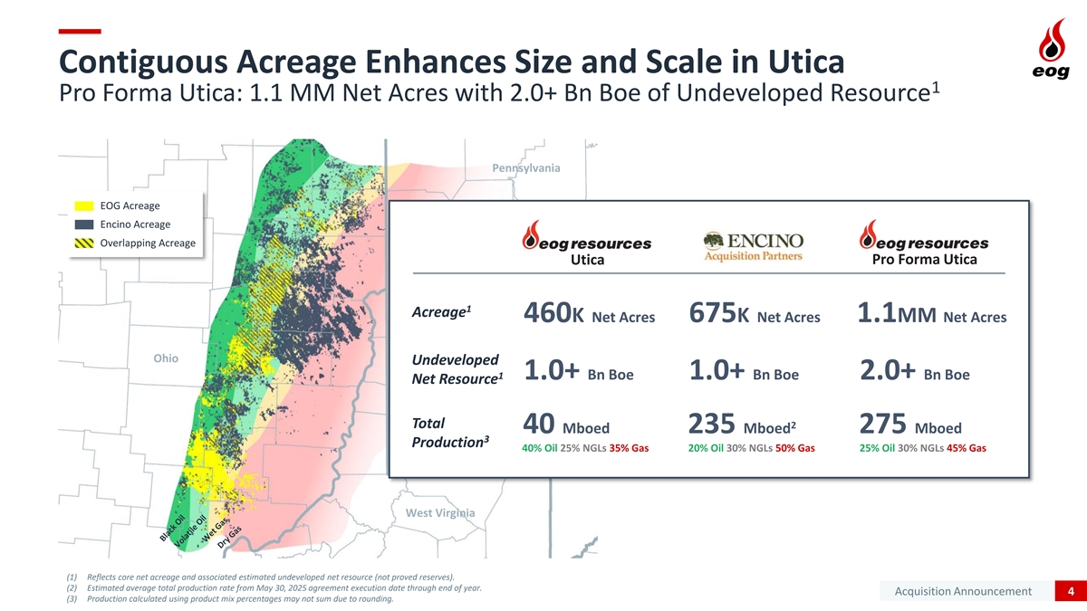 Accretive Acquisition Creates Premier Utica Asset Position Acquisition Highlights: Size, Scale, Synergies, Returns, & Accretion Strong Strategic Fit Returns Focused Acquisition Expands Utica Asset Size and Scale Enhances Liquids Acreage Footprint 1 2 • Acquiring 675K Net Acres & 1.0+ Bn Boe of Undeveloped Net Resource• Acquiring 235K Net Acres in the Volatile Oil Window 3 • Pro Forma Utica Totals 1.1 Million Net Acres & 2.0+ Bn Boe of • Pro Forma Utica Volatile Oil Window Totals 485K Net Acres 2 Undeveloped Net Resource• Delivers Operational Efficiencies Through Extended Laterals Immediately Accretive, Meaningful Synergies Adds Premium Gas Exposure • Accretive to EBITDA, CFO, FCF, NAV, & All Per Share Metrics• Acquiring 330K Net Acres Across Wet and Dry Gas Windows • Estimated $150MM of Synergies Realized in First Year Primarily Driven By • Pro Forma Gas Window Totals 405K Net Acres Lower Capital, Operating, & Debt Financing Costs • Ample Processing Capacity & Firm Transportation to • Benefits from Extended Laterals, Shared Facilities, & Self-Sourced Materials Premium End Markets EOG Technical Expertise Enhances Returns Increases Working Interest • Industry Leading Drilling and Completions Technology Lowers Well • Average Working Interest Increased by 20%+ in Northern Acreage Costs and Enhances Production Performance• Highly Contiguous Northern Acreage Position Enables Extended • Applying EOG’s Proprietary Information & Optimizer Technology to a Lateral Development Higher Production Base Lowers Operating Costs (1) Reflects core net acreage. Total acquired acreage of ~1.2 MM net acres. (2) Net resource potential, not proved reserves. See related discussion under “Oil and Gas Reserves” on slide 12. Acquisition Announcement 3 (3) Reflects pro forma core net acreage.