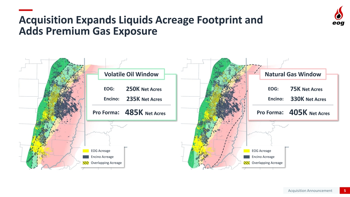 Contiguous Acreage Enhances Size and Scale in Utica 1 Pro Forma Utica: 1.1 MM Net Acres with 2.0+ Bn Boe of Undeveloped Resource Pennsylvania EOG Acreage Encino Acreage Overlapping Acreage Utica Pro Forma Utica 1 Acreage 460K Net Acres 675K Net Acres 1.1MM Net Acres Ohio Undeveloped 1 1.0+ Bn Boe 1.0+ Bn Boe 2.0+ Bn Boe Net Resource Total 2 40 Mboed 235 Mboed 275 Mboed 3 Production 40% Oil 25% NGLs 35% Gas 20% Oil 30% NGLs 50% Gas 25% Oil 30% NGLs 45% Gas West Virginia (1) Reflects core net acreage and associated estimated undeveloped net resource (not proved reserves). (2) Estimated average total production rate from May 30, 2025 agreement execution date through end of year. Acquisition Announcement 4 (3) Production calculated using product mix percentages may not sum due to rounding.