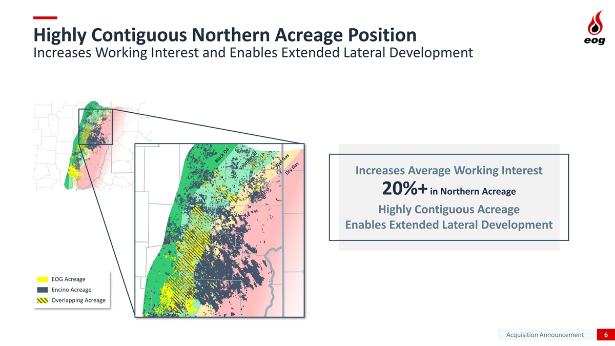Acquisition Expands Liquids Acreage Footprint and Adds Premium Gas Exposure Volatile Oil Window Natural Gas Window EOG: EOG: 250K Net Acres 75K Net Acres Encino: Encino: 235K Net Acres 330K Net Acres Pro Forma: Pro Forma: 485K Net Acres 405K Net Acres EOG Acreage EOG Acreage Encino Acreage Encino Acreage Overlapping Acreage Overlapping Acreage Acquisition Announcement 5