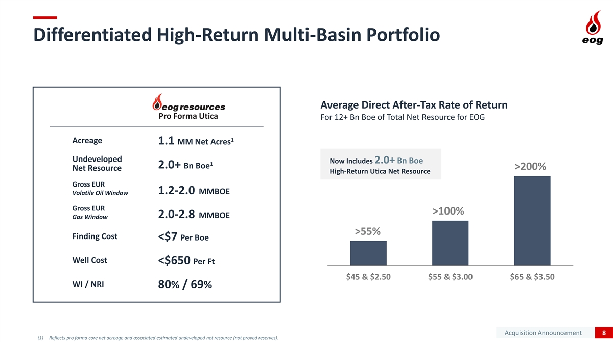 EOG Technical Expertise Enhances Returns in Acquired Acreage 1 Average Cumulative Oil & Total Production Total Well Cost Total Production, Boe/ft $/ft Oil Production, Bo/ft Lower 30 ~15% TWC/ft EOG EOG Volatile Oil Window +10% Boe/ft Encino Volatile Oil Window 800 25 ~$750/ft 750 20 700 15 <$650/ft EOG 650 +8% Bo/ft 10 600 5 550 0 500 0 2 4 6 8 10 1 Year12 En Enc ciin n oo EOG EOG Acquisition Announcement 7 (1) 2022-2024 average cumulative production for wells in the volatile oil window.