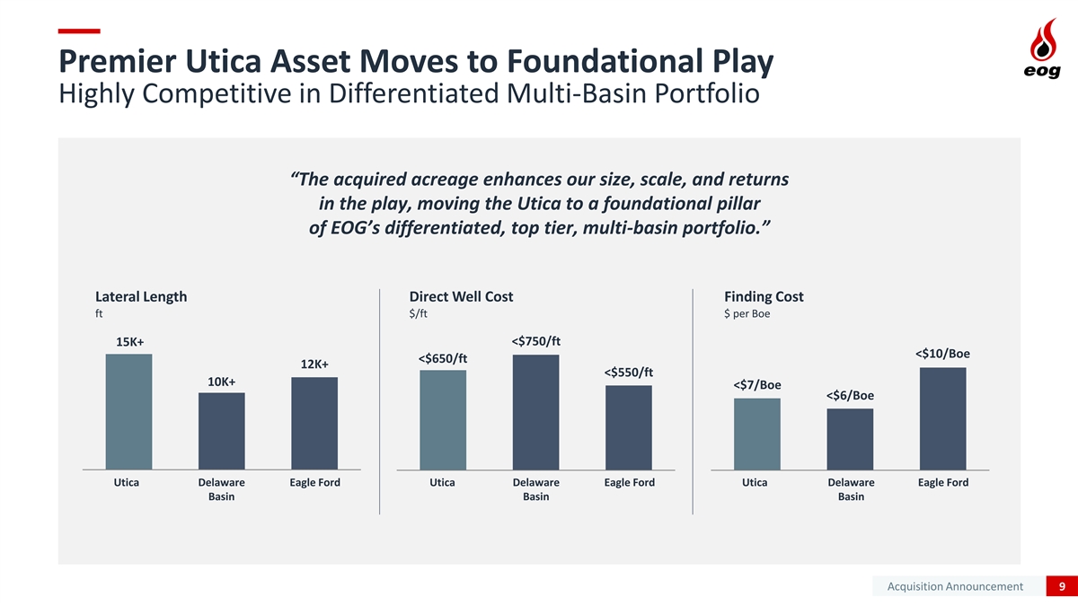 Differentiated High-Return Multi-Basin Portfolio Average Direct After-Tax Rate of Return Pro Forma Utica For 12+ Bn Boe of Total Net Resource for EOG 1 Acreage 1.1 MM Net Acres Undeveloped Now Includes 2.0+ Bn Boe 1 2.0+ Bn Boe >200% Net Resource 200% High-Return Utica Net Resource Gross EUR 1.2-2.0 MMBOE Volatile Oil Window Gross EUR >100% 100% 2.0-2.8 MMBOE Gas Window >55% 55% Finding Cost <$7 Per Boe Well Cost <$650 Per Ft $45 & $2.50 $55 & $3.00 $65 & $3.50 WI / NRI 80% / 69% Acquisition Announcement 8 (1) Reflects pro forma core net acreage and associated estimated undeveloped net resource (not proved reserves).