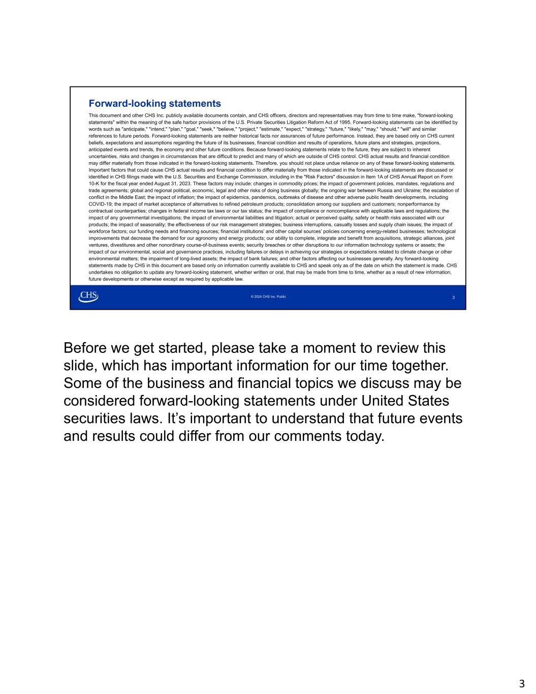 2© 2024 CHS Inc. Public Welcome Thank you for joining us today. 2