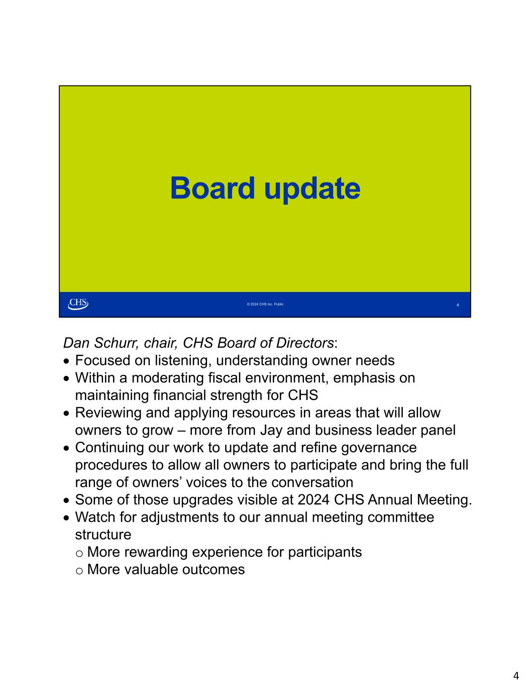 © 2024 CHS Inc. Public 3 Forward-looking statements This document and other CHS Inc. publicly available documents contain, and CHS officers, directors and representatives may from time to time make, "forward-looking statements" within the meaning of the safe harbor provisions of the U.S. Private Securities Litigation Reform Act of 1995. Forward-looking statements can be identified by words such as "anticipate," "intend," "plan," "goal," "seek," "believe," "project," "estimate," "expect," "strategy," "future," "likely," "may," "should," "will" and similar references to future periods. Forward-looking statements are neither historical facts nor assurances of future performance. Instead, they are based only on CHS current beliefs, expectations and assumptions regarding the future of its businesses, financial condition and results of operations, future plans and strategies, projections, anticipated events and trends, the economy and other future conditions. Because forward-looking statements relate to the future, they are subject to inherent uncertainties, risks and changes in circumstances that are difficult to predict and many of which are outside of CHS control. CHS actual results and financial condition may differ materially from those indicated in the forward-looking statements. Therefore, you should not place undue reliance on any of these forward-looking statements. Important factors that could cause CHS actual results and financial condition to differ materially from those indicated in the forward-looking statements are discussed or identified in CHS filings made with the U.S. Securities and Exchange Commission, including in the "Risk Factors" discussion in Item 1A of CHS Annual Report on Form 10-K for the fiscal year ended August 31, 2023. These factors may include: changes in commodity prices; the impact of government policies, mandates, regulations and trade agreements; global and regional political, economic, legal and other risks of doing business globally; the ongoing war between Russia and Ukraine; the escalation of conflict in the Middle East; the impact of inflation; the impact of epidemics, pandemics, outbreaks of disease and other adverse public health developments, including COVID-19; the impact of market acceptance of alternatives to refined petroleum products; consolidation among our suppliers and customers; nonperformance by contractual counterparties; changes in federal income tax laws or our tax status; the impact of compliance or noncompliance with applicable laws and regulations; the impact of any governmental investigations; the impact of environmental liabilities and litigation; actual or perceived quality, safety or health risks associated with our products; the impact of seasonality; the effectiveness of our risk management strategies; business interruptions, casualty losses and supply chain issues; the impact of workforce factors; our funding needs and financing sources; financial institutions’ and other capital sources’ policies concerning energy-related businesses; technological improvements that decrease the demand for our agronomy and energy products; our ability to complete, integrate and benefit from acquisitions, strategic alliances, joint ventures, divestitures and other nonordinary course-of-business events; security breaches or other disruptions to our information technology systems or assets; the impact of our environmental, social and governance practices, including failures or delays in achieving our strategies or expectations related to climate change or other environmental matters; the impairment of long-lived assets; the impact of bank failures; and other factors affecting our businesses generally. Any forward-looking statements made by CHS in this document are based only on information currently available to CHS and speak only as of the date on which the statement is made. CHS undertakes no obligation to update any forward-looking statement, whether written or oral, that may be made from time to time, whether as a result of new information, future developments or otherwise except as required by applicable law. Before we get started, please take a moment to review this slide, which has important information for our time together. Some of the business and financial topics we discuss may be considered forward-looking statements under United States securities laws. It’s important to understand that future events and results could differ from our comments today. 3
