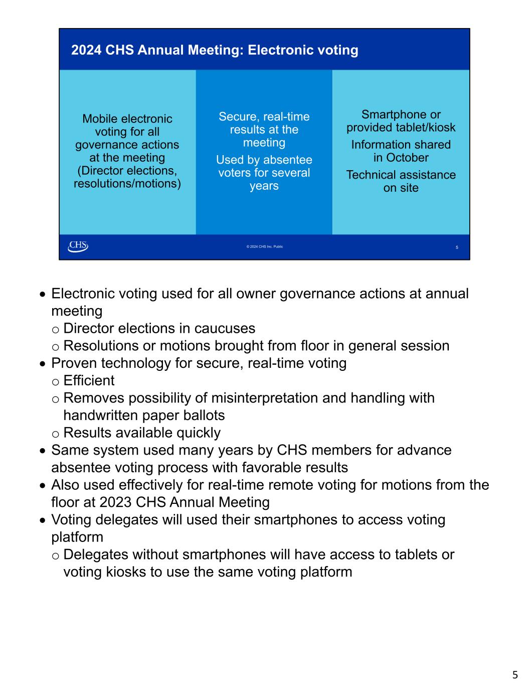 5© 2024 CHS Inc. Public Secure, real-time results at the meeting Used by absentee voters for several years Smartphone or provided tablet/kiosk Information shared in October Technical assistance on site Mobile electronic voting for all governance actions at the meeting (Director elections, resolutions/motions) 2024 CHS Annual Meeting: Electronic voting  Electronic voting used for all owner governance actions at annual meeting o Director elections in caucuses o Resolutions or motions brought from floor in general session  Proven technology for secure, real-time voting o Efficient o Removes possibility of misinterpretation and handling with handwritten paper ballots o Results available quickly  Same system used many years by CHS members for advance absentee voting process with favorable results  Also used effectively for real-time remote voting for motions from the floor at 2023 CHS Annual Meeting  Voting delegates will used their smartphones to access voting platform o Delegates without smartphones will have access to tablets or voting kiosks to use the same voting platform 5