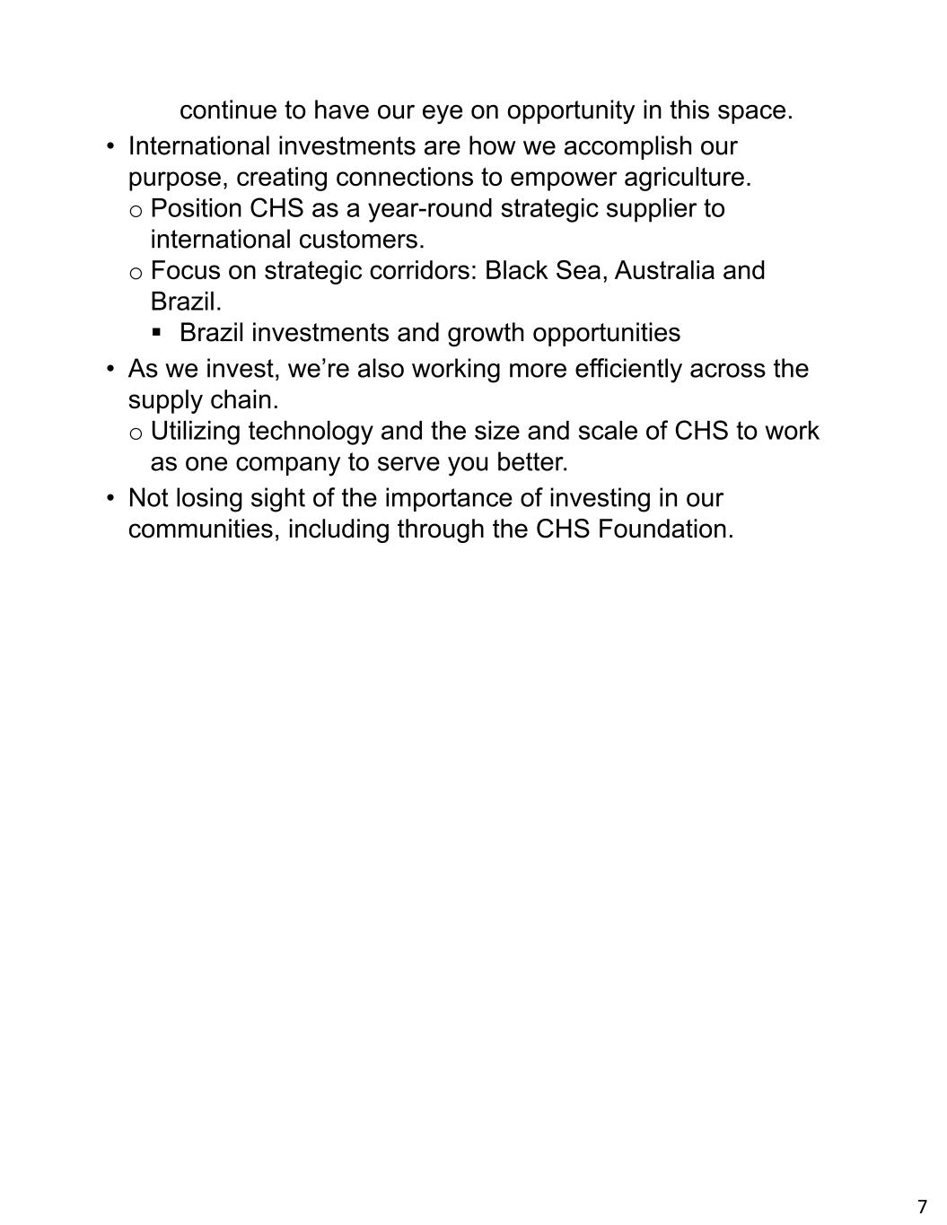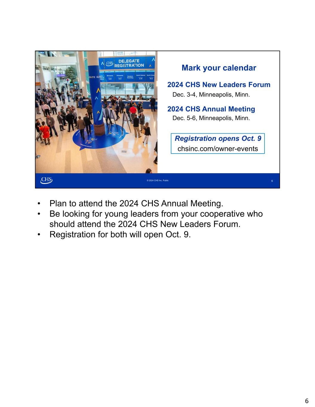 Mark your calendar 6© 2024 CHS Inc. Public 2024 CHS Annual Meeting Dec. 5-6, Minneapolis, Minn. 2024 CHS New Leaders Forum Dec. 3-4, Minneapolis, Minn. Registration opens Oct. 9 chsinc.com/owner-events • Plan to attend the 2024 CHS Annual Meeting. • Be looking for young leaders from your cooperative who should attend the 2024 CHS New Leaders Forum. • Registration for both will open Oct. 9. 6