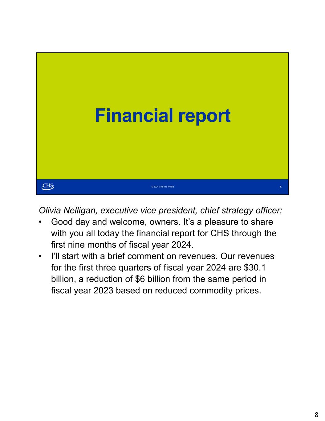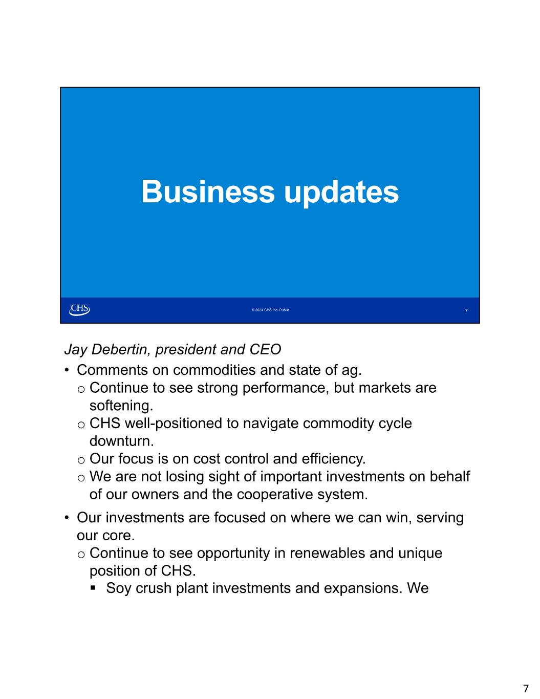 Business updates 7© 2024 CHS Inc. Public Jay Debertin, president and CEO • Comments on commodities and state of ag. o Continue to see strong performance, but markets are softening. o CHS well-positioned to navigate commodity cycle downturn. o Our focus is on cost control and efficiency. o We are not losing sight of important investments on behalf of our owners and the cooperative system. • Our investments are focused on where we can win, serving our core. o Continue to see opportunity in renewables and unique position of CHS.  Soy crush plant investments and expansions. We 7